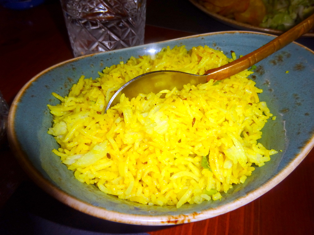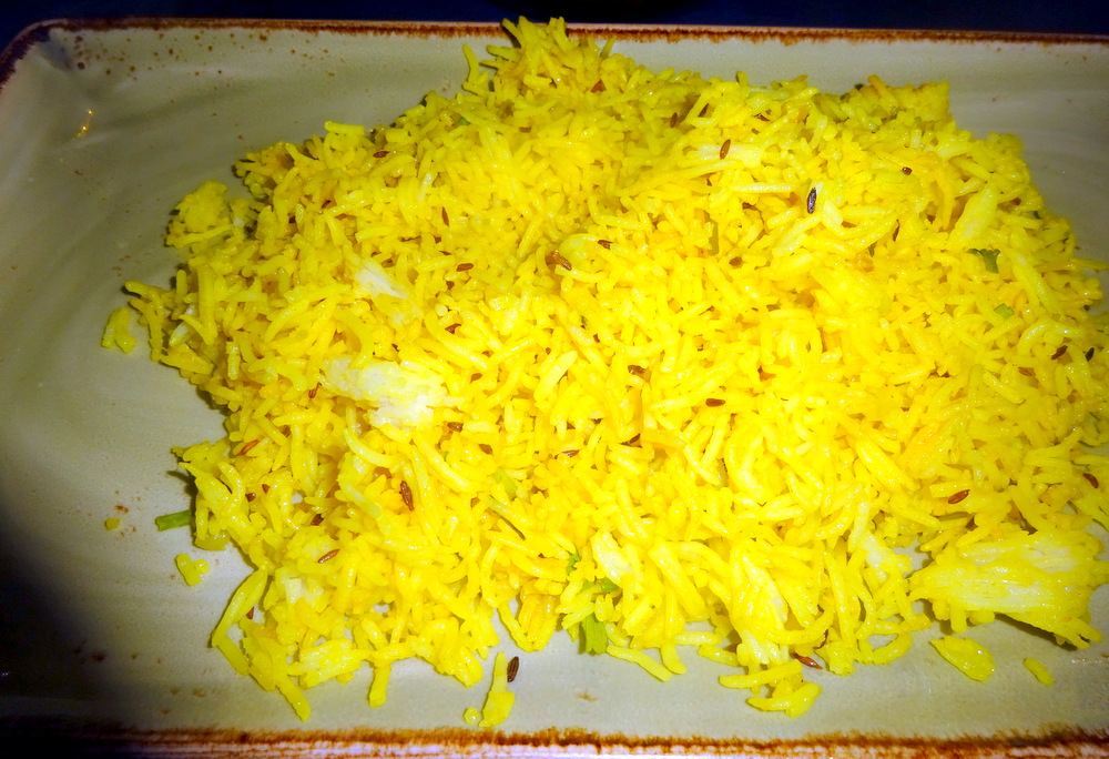 The Jeera Rice was decanted on to the cold rectangular plate. This was a sensibly sized portion of Rice, but Chef had been a bit mean with the Cumin Seeds.