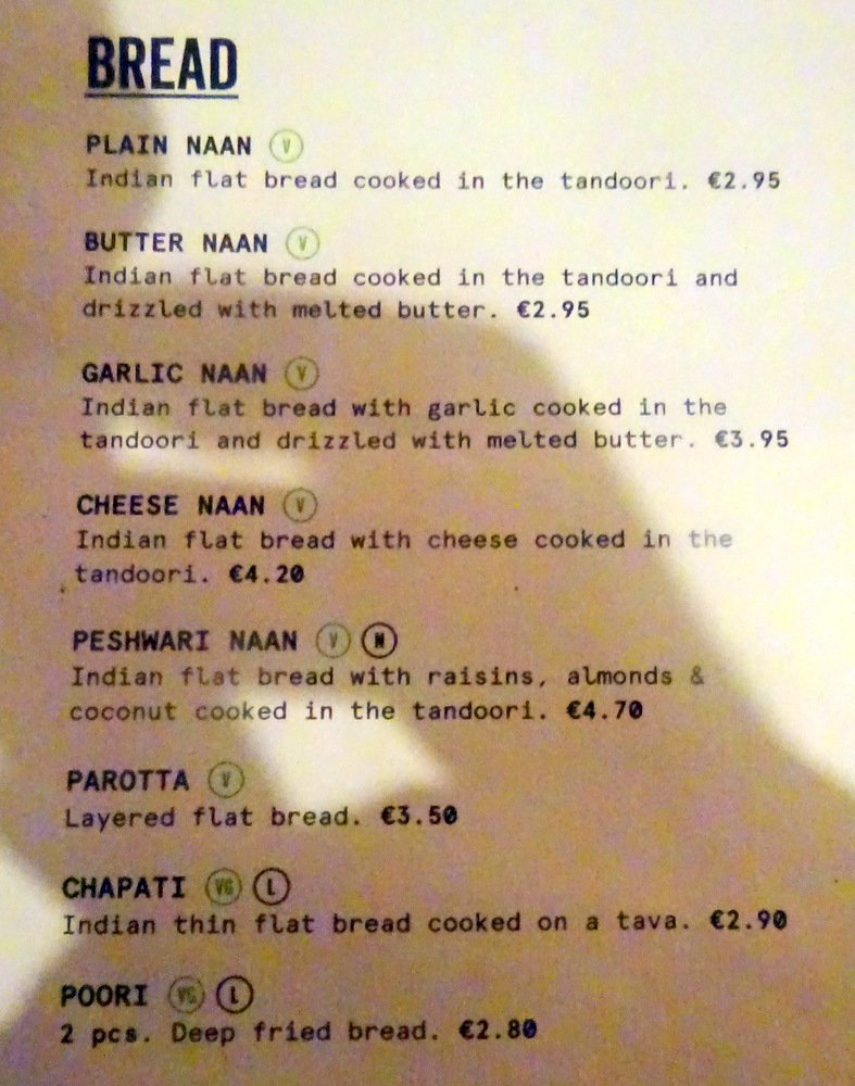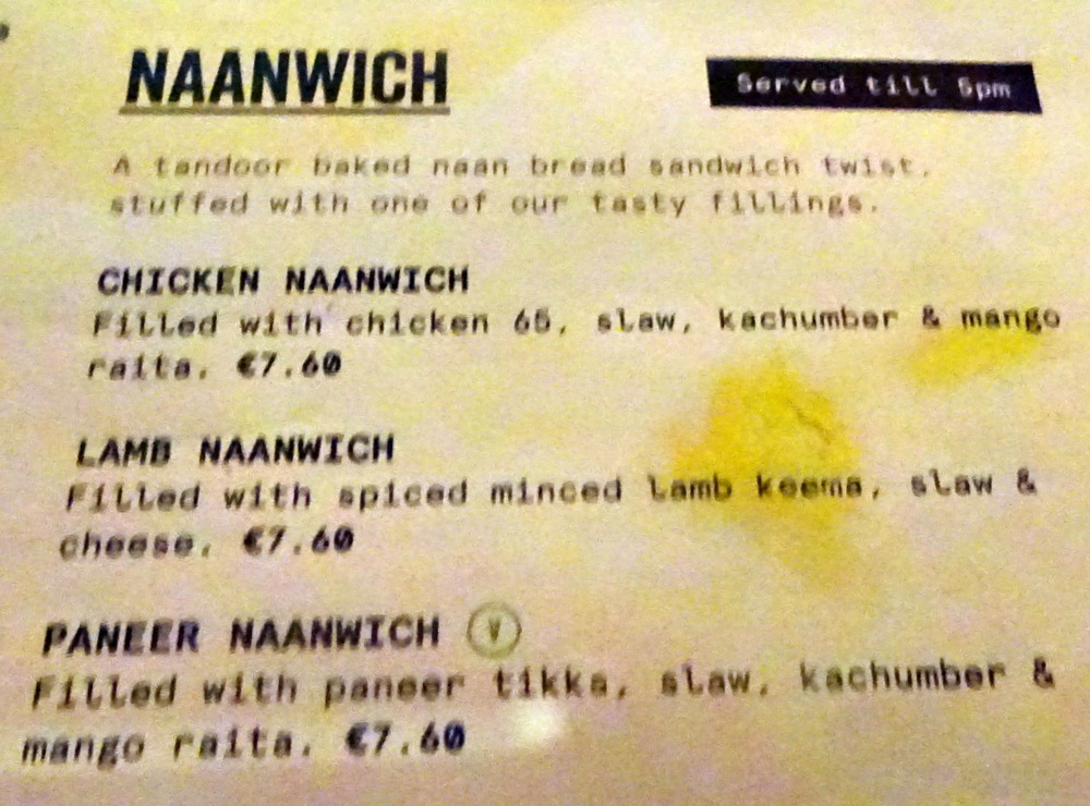 Mein Host suggested Lamb Naanwich (€7.60). This was accepted. A 0.75l Bottle of Sparkling Water (€3.80) completed the Order.
