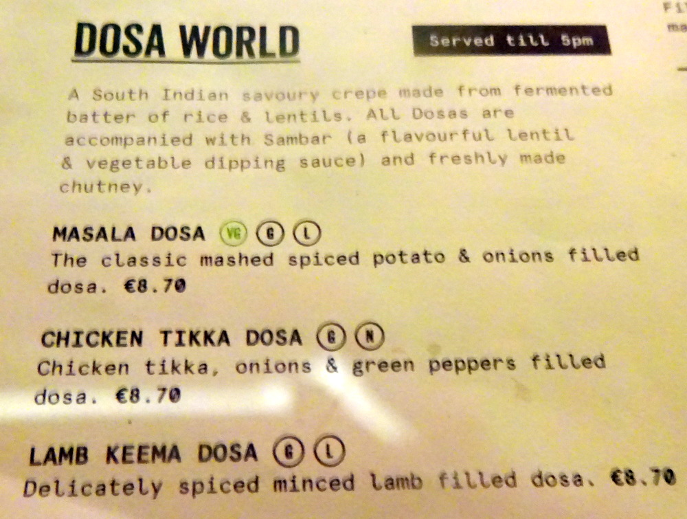 Jeera Rice (€3.70) would accompany, we agreed on – Hot – at the time of ordering for the Chettinad. Hector was sorted, Marg was less fortunate. Instead of her customary lunchtime Samosa, Marg decided upon Lamb Keema Dosa (€8.70).