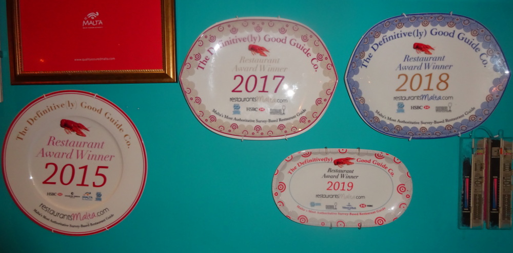The very colourful Menu was provided, in fact the whole room seemed very colourful. The picture of the Taj Mahal reminded me of the Scottish flag, what was that about? Plates adorned the wall, each commemorating an award for a specific year. There was a small plate for 2019 already. Who wins Awards?