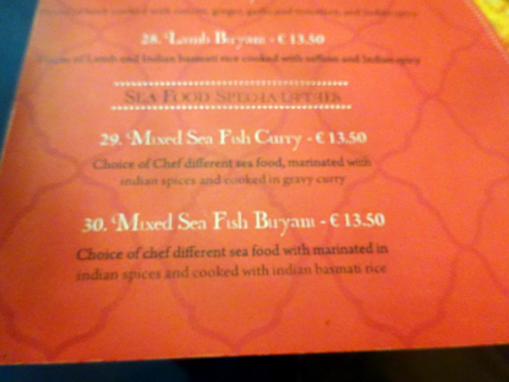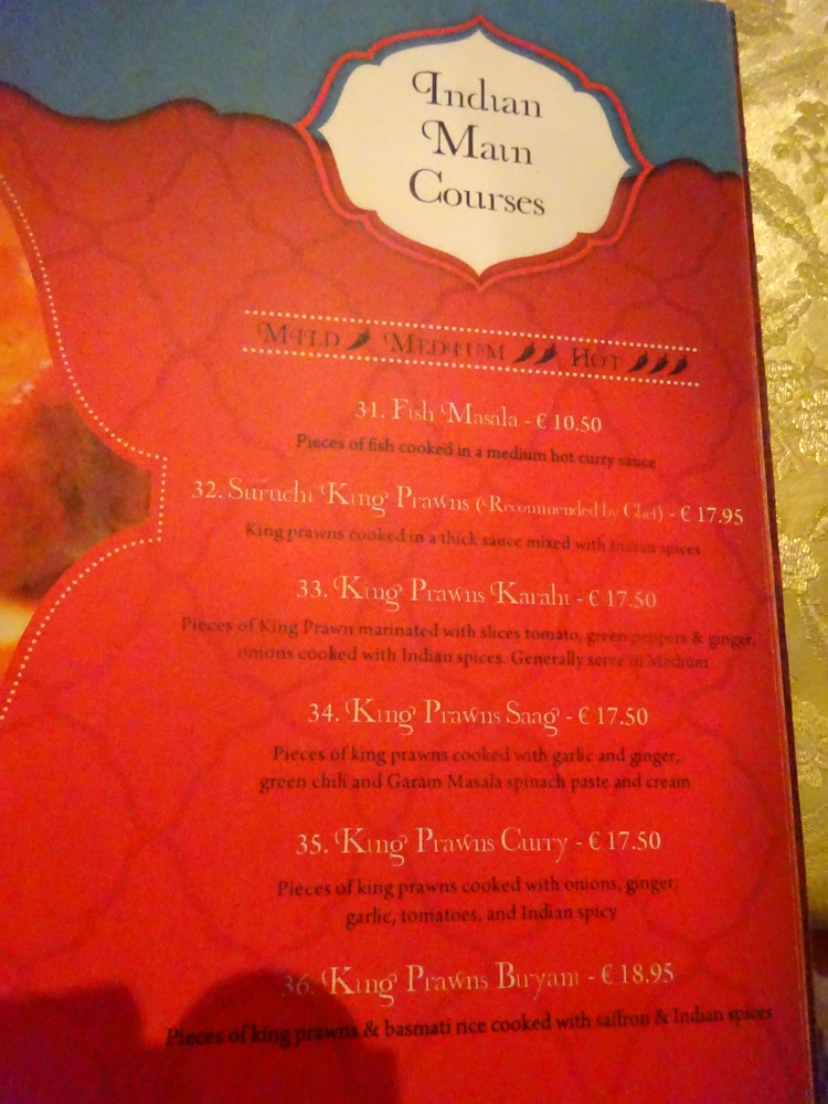 The Chicken section of the Menu was extensive. All the Curry Menus I have seen in Malta have featured Beef and Lamb, the latter always being more expensive. Chicken Karahi and Beef Karahi were both available, even King Prawn Karahi (€17.50), no Lamb Karahi.