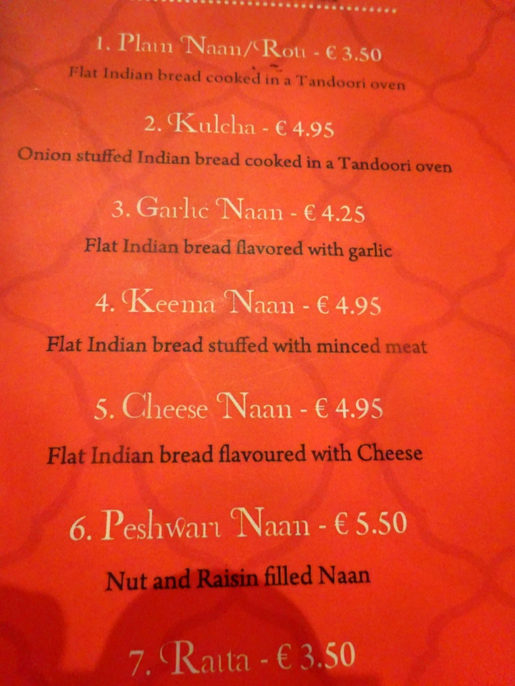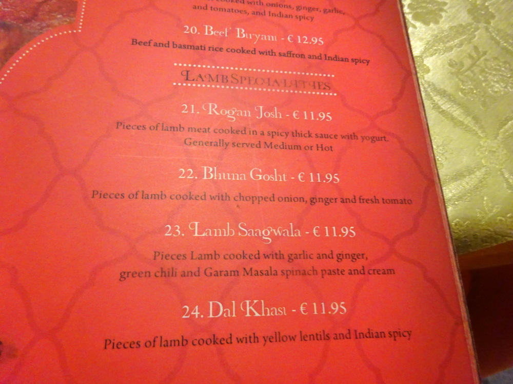 I considered Rogan Josh (€11.95) but the mention of – Yoghurt – put me off, I prefer the Traditional Tomato-rich interpretation. Bhuna Gosht (€11.95) it would be accompanied by a Plain Naan (€3.50). No way was I paying the asking price for Rice. €3.50 for a Roti was also ridiculous.