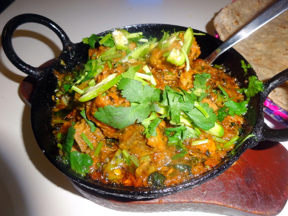 Large Green Chillies topped the Karahi Gosht along with Fresh Coriander Stems and Leaves. The Chillies had been cut lengthwise, the Coriander Stems would add a sense of – Grittiness. Beneath the – forest – the Oil sizzled, this Curry was far too hot to touch, but as nature has decreed, not too hot to eat. I tore a strip from the equally hot Wholemeal Chapatti. How good it was to see Bread being charged at an honourable price. I scooped some of the Masala Mash with the Chapatti… ‘kin’ell!