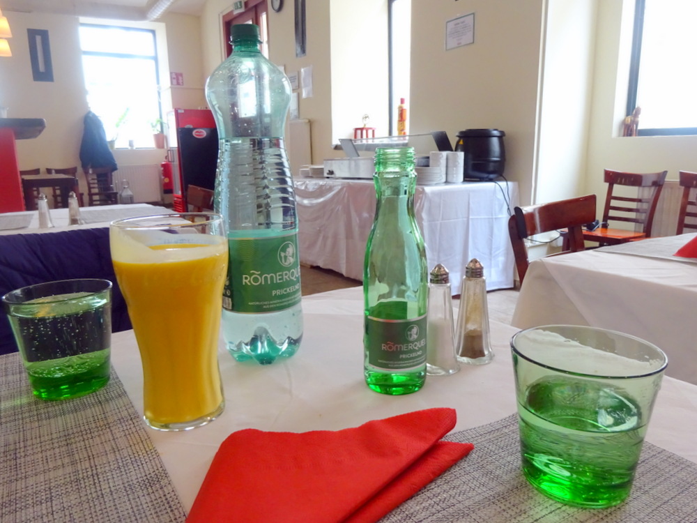 As always, Hector desired Sparling Water, and as much of it as possible at a decent price. A 750ml bottle (€5.20) was on the Menu, pricey, once again. Bier was better value, but it was early. Marg saw – vom Fass – and unwittingly looked at the Bier prices. She was then convinced no large bottles of Sparkling Water were available, but saying – vom Fass – had planted – Bier – in Our Hostess’ mind. Hector asked for a large bottle of Sparkling Water regardless.