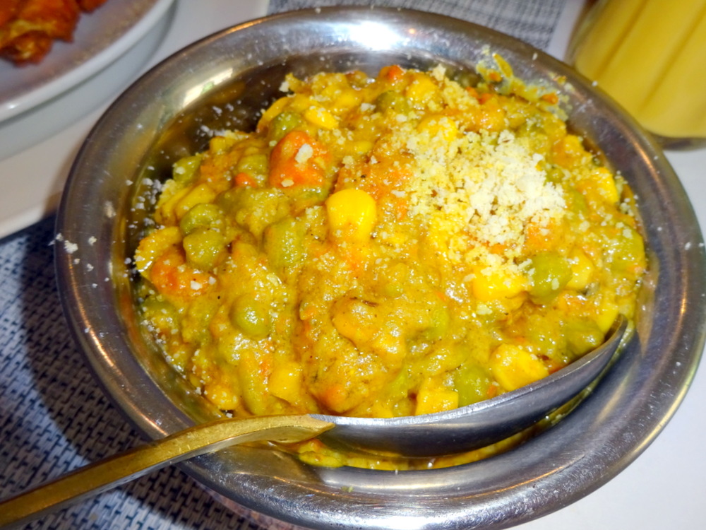 The Pakora was light in colour and almost glistened. This was freshly made Pakora, not the double fried that prevails. There was a lot of it, a dozen pieces or so of various sizes, Mango Chutney accompanied.