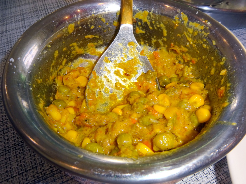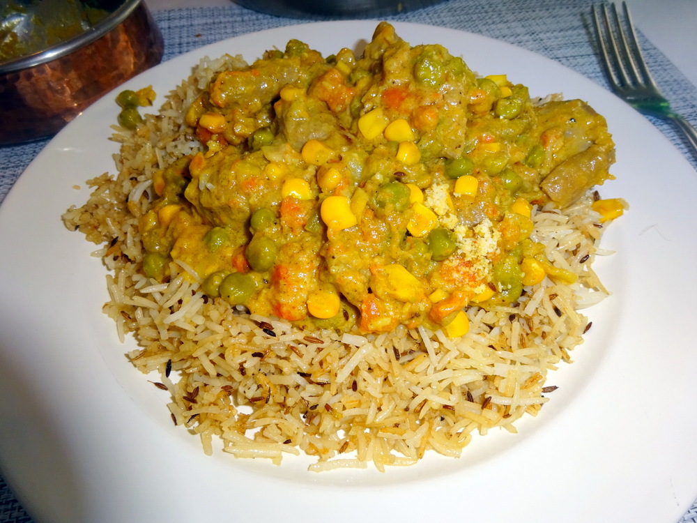 The Vegetables stood out in the Thick Masala. The Topping was presumably – Ground Almonds. This Curry had potential. I counted the Meat content into double figures as I decanted most of the pot on to the Rice. Peas, Sweetcorn and Carrots were part of the mix, a fine array of – Interesting Vegetables. The ratio of the slightly Creamy Masala to Solids was very favourable, this was a suitably – Dry Curry, the antithesis of the – soupy rubbish – served to Marg and Hector two nights ago in Bratislava. .
