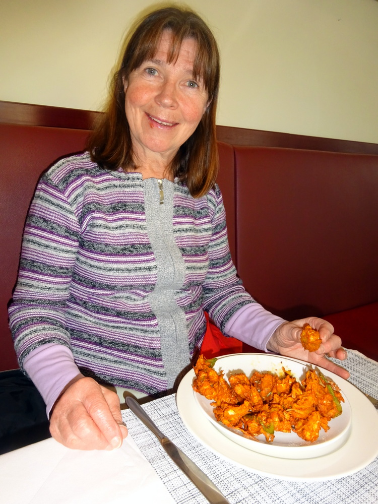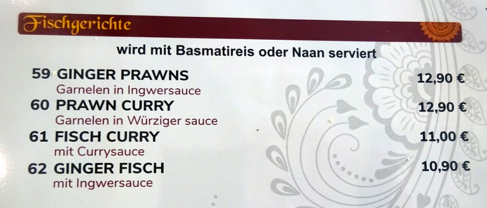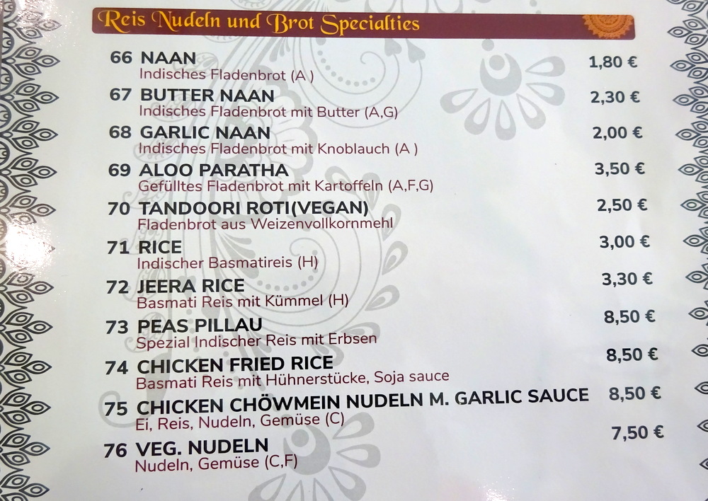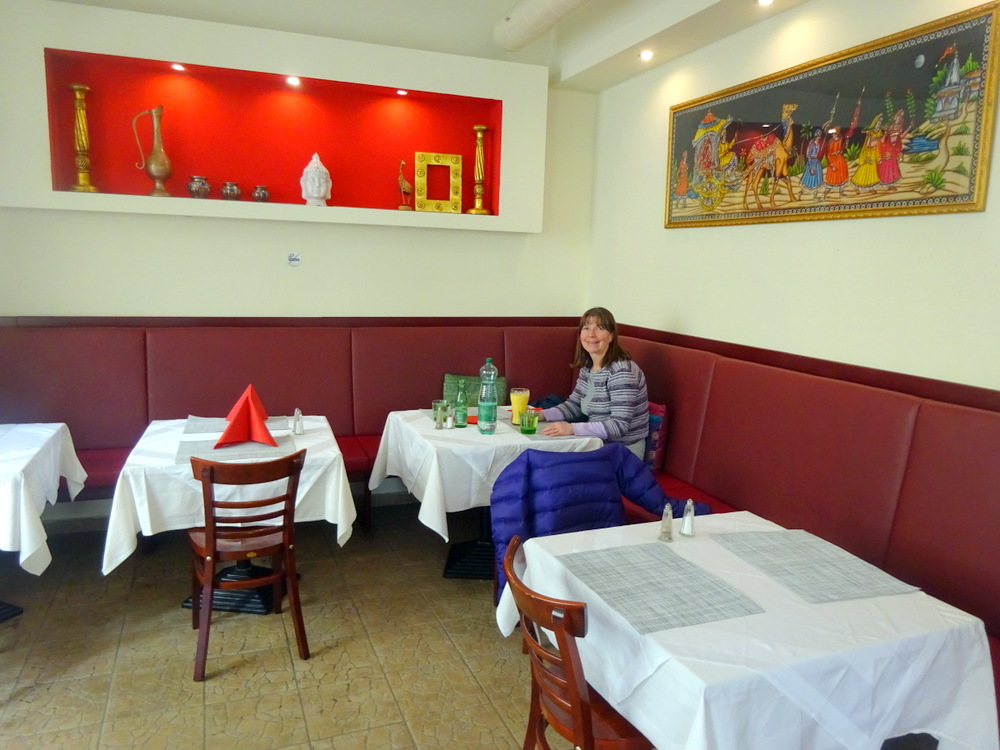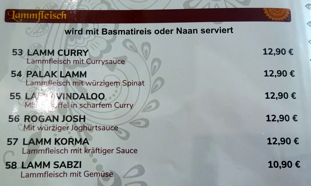 Marg and Hector entered Flavours of India just after noon, we were not the first customers, the Restaurant opens daily at 11.00 (until 22.00). We took a corner table in the L-shaped room, die Hausherrin brought the Menu. As is the lunchtime way, Marg would have a Starter whilst Hector would have his Curry. Lamm Sabzi (€10.90) would satisfy the need for Meat with Vegetables, Jeera Rice (€3.30) would accompany. For Marg, Veg Pakora (€6.50) with a 500ml glass of Mango Lassi (€2.20). This was a very good price for Mango Lassi. Our Hostess came to take the Order.