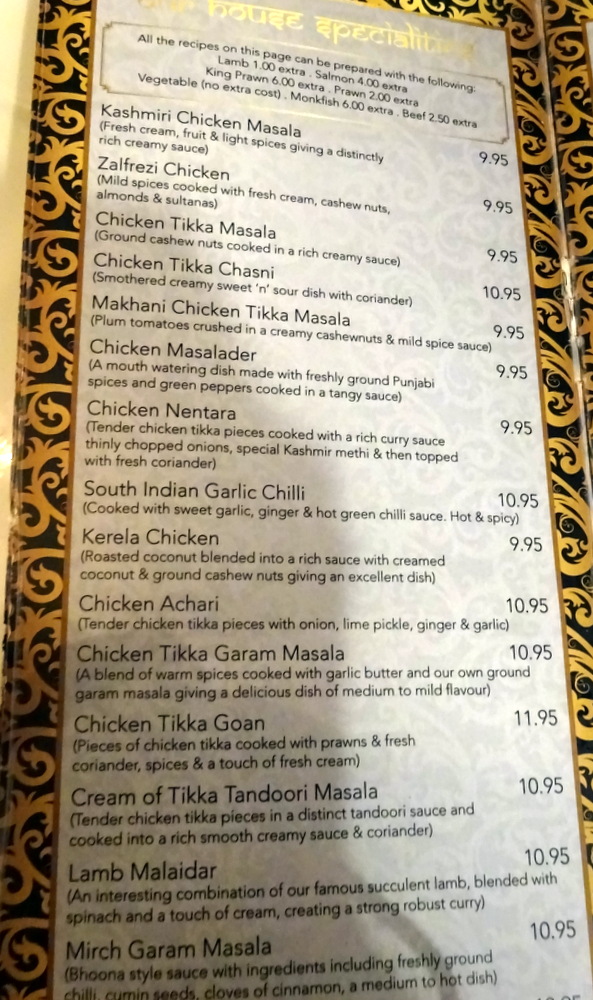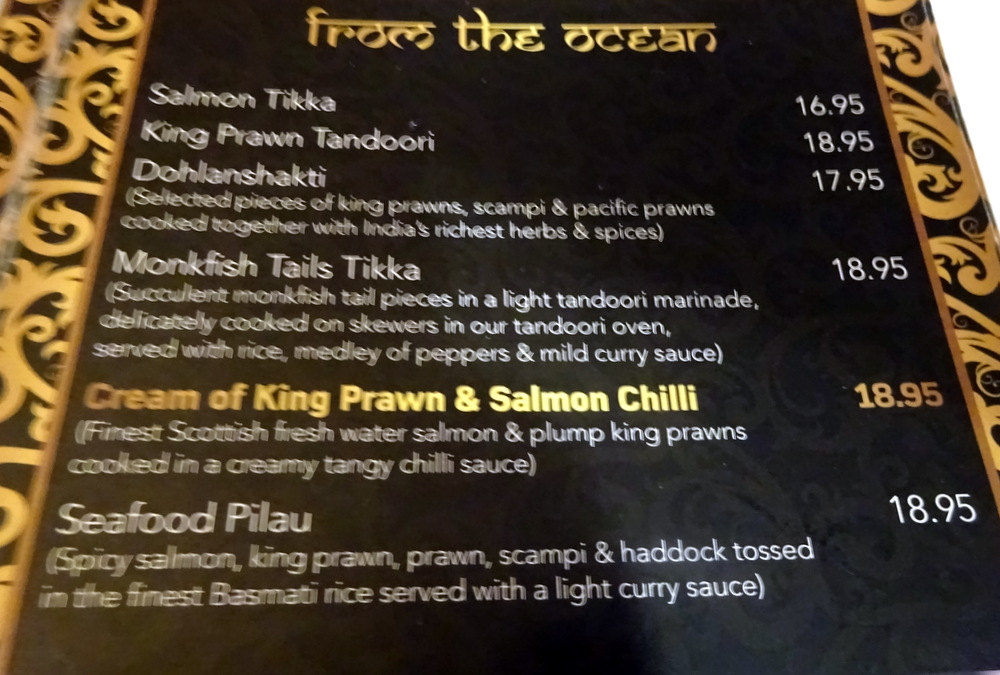 In Europe, Fish Curry generally costs less than Meat Curry. I was taken aback by the prices in the – From the Ocean – section of the Menu. Wendy was caught in the net, Dohlanshakti (£17.95) is a mix of Prawns. Prawn Curry, possibly the easiest Curry to prepare: take some Base Masala, chuck in some Prawns, no more cooking required. I know the price of Prawns and how many one gets for the equivalent price/weight of Beef Steak. Prawn Curry is a waste of Prawns, there, it is written.