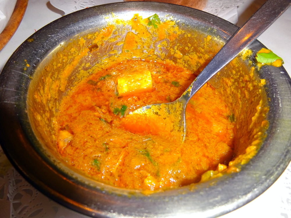 This looked wonderful. The pot was piled high with solids, Prawns of differing sizes I was told. Once more I was invited to have a sample. I took some of the Masala only, in keeping with my views on Prawn Curry. Again there was a – Tang – but a markedly different one. That the contents had indeed – come from the ocean – was most apparent from the poweful Flavours. How much bland Fish Curry has Hector been served over the years? This Masala served with Tilapia (not on the Menu) could be very interesting. (Hector is not a huge fan of Monkfish which is on the Menu.)