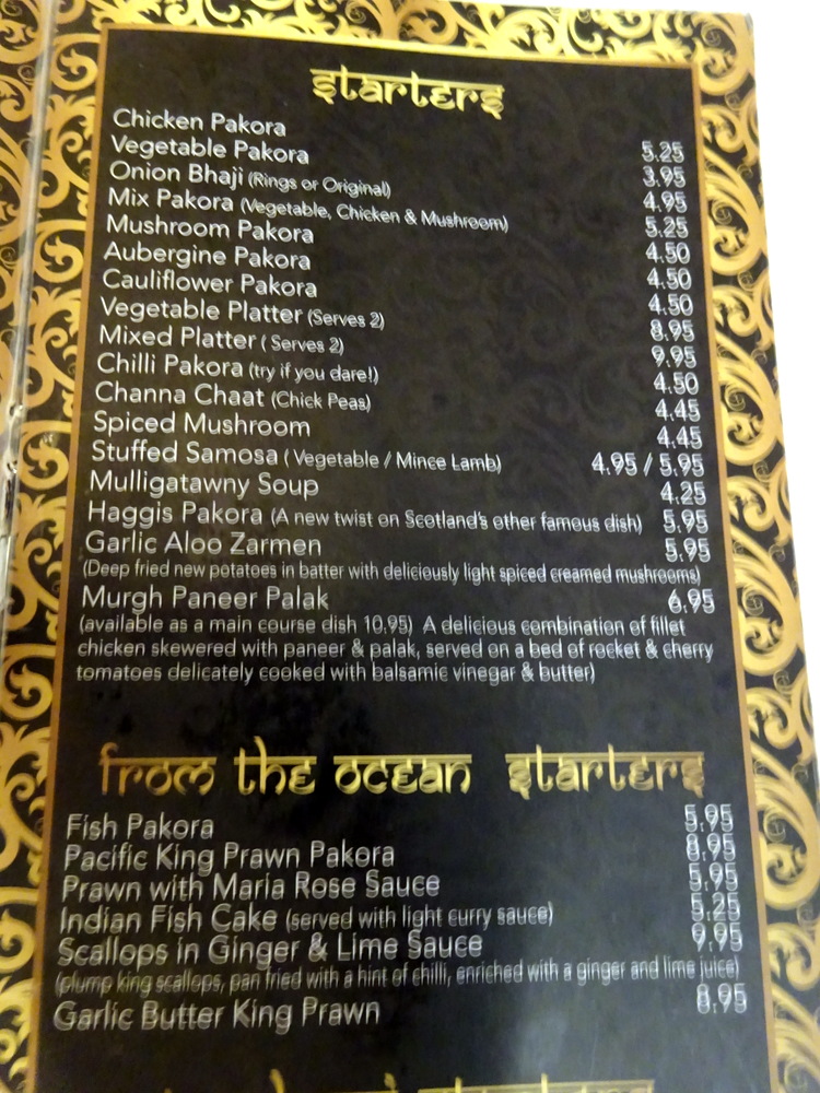Lamb Desi (£11.95) stood out, this would surely show what the Chef at Turban Tandoori is capable of? Peter would have this also. Marg spotted something with – Mint – which is quite ironic given that this was close to her choice on that ill fated visit to The New Turban. Lamb Dhahi (£10.95) it would be. Marg had spotted Haggis Pakora (£5.95), Starter, and was becoming like a dog with a bone. Only one Starter would be ordered, we all agreed to share, as required.