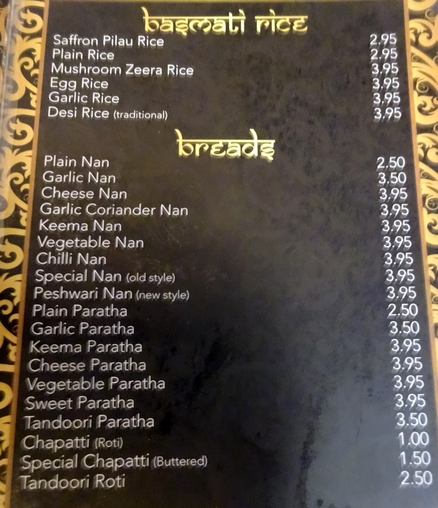 When the Waiter came to take the Order, it was verified that no Capsicum was part of the Lamb Desi. I enquired also about the Desi Rice (£3.95). The given description sounded like – Jeera Rice – so Marg and Hector would share Mushroom Zeera Rice (£3.95) which would provide the – Interesting Vegetable – and should also guarantee Cumin Seeds. A Plain Paratha (£2.50) completed our part of the Order. Wendy and Peter agreed to share a Garlic Nan (£3.50).