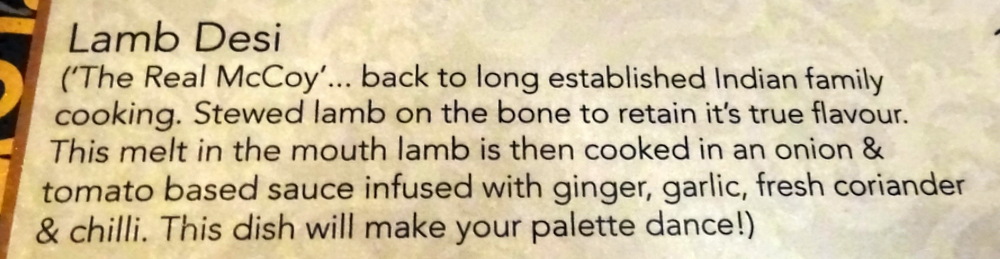 Mint leaves topped what appeared to be standard Blended Masala. The Lamb Dhahi looked no more than a Mainstream Curry. Marg was immediately impressed, I took a sample of the Masala. There was a quite distinctive – Tang. Mint is not Hector’s thing unless it is shrouded in Chocolate. The Mint did not dominate, the blend of Flavours was full on, the Soupçon impressed.