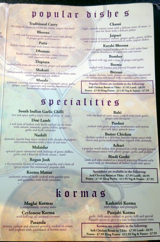 Keema Padora (£5.25) was one of the main reasons why I chose to come here, this excellent Starter has been missed. Marg claimed never to have seen one never mind had one, strange, because a well known and reliable Curry Blog gives an account of her eating half of a Keema Padora on our previous visit. Marg was caught in two minds, Keema Mattar (£8.95) or Lamb Rogan Josh (£8.95). Despite having essentially the same thing twice, Marg went for Keema Mattar with one Chapatti (£1.00). I asked for the Desi Lamb (£8.95) to have extra Methi added hoping to recreate the famed – Lamb Gurmeet – which Hector inspired at Punjabi (Charing Cross). Bread had to be the accompaniment, a Plain Paratha (£2.10) completed the food order. The Birthday Boy decided to have Strongbow, served from a can, to wash this down. No – pinta’ lager. Marg had Soda & Lime.