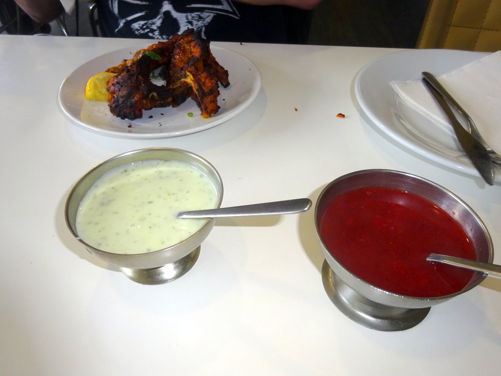 The Chops were comparatively pale, one assumes down to the Yoghurt marinade. The extremities were burnt as is required. We were offered Sauces by the serving lady, I asked for Hot Red, Alan the Light. All was well, two Chaps gorging. Great Chops.