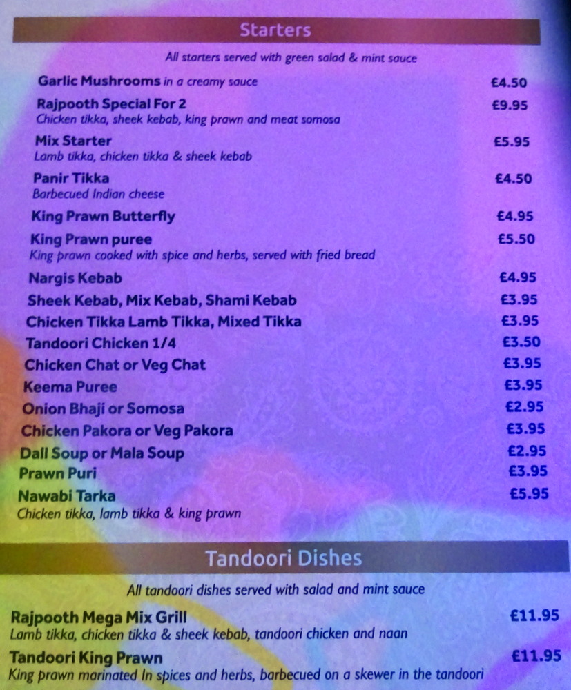 At 21.15, Rajpooth was remarkably quiet, nine diners sat at three tables. This was not a good sign given what we had just witnessed elsewhere. Mein Host led us to a table, it was he who would serve us thereafter.
