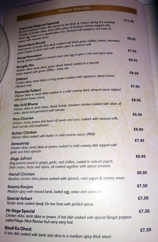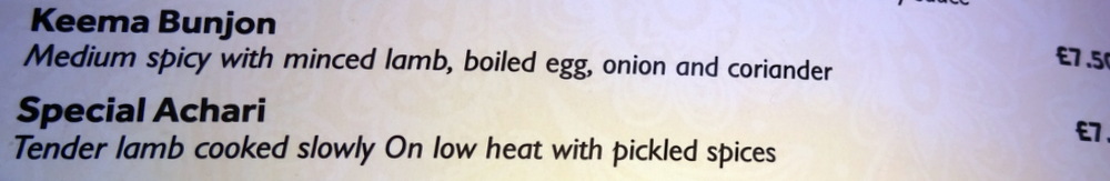 The Menu proved to be quite an interesting read, many Dishes here were unique. The prices were mostly very agreeable. I read a fair bit of the Menu to Clive, Keema Bunjon (£7.50) took his fancy. Beneath that lay Special Achari (£7.50), Hector was certainly in the mood for some Pickle. To accompany, Clive asked for a Keema Naan (£2.75), my – almost becoming – customary Chilli and Coriander Naan (£2.95) was doable.