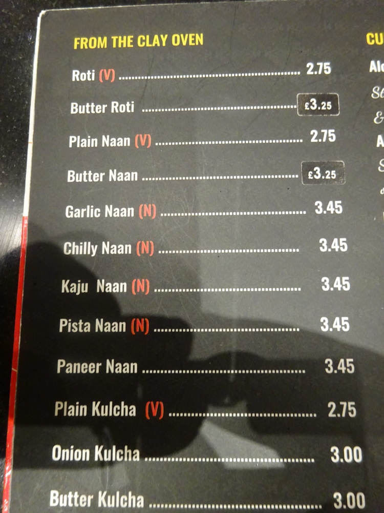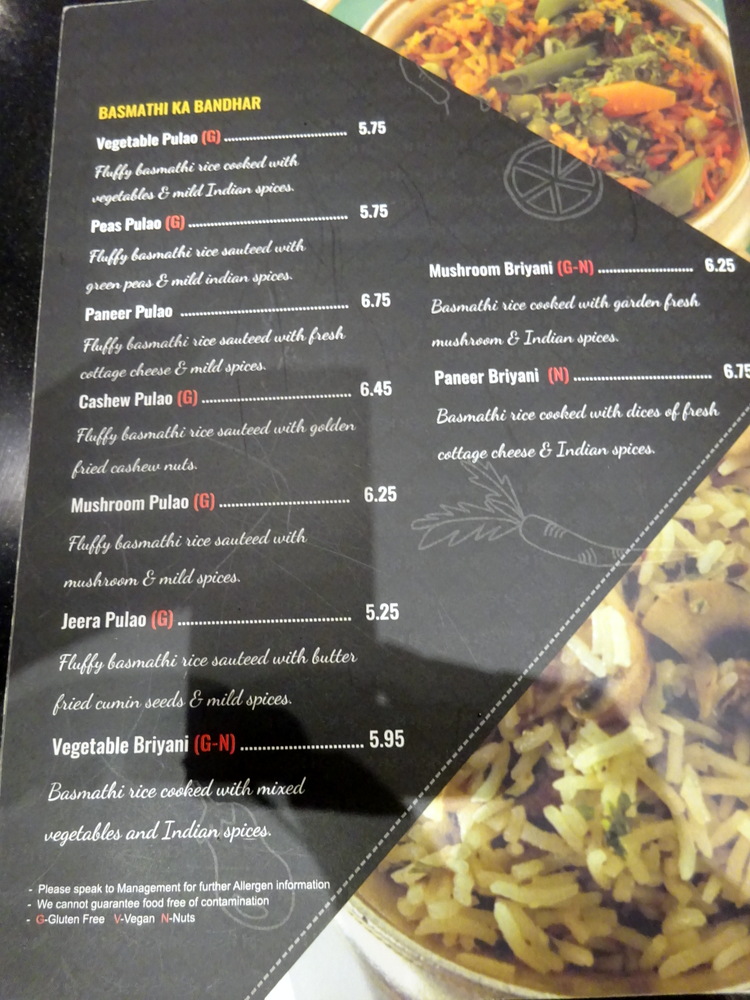 I have been in this Croydon version of Sarvanna three times and each time had one of the two Thalis on offer. No idea what they have done to the menu but I would not have ordered anything without knowing what the damage was going to be. From memory it was £8-9. Food was decent enough but their breads were appalling.I gave up eventually when on last occasion my chapati had the consistency of a Frisbee dipped in liquid nitrogen and on complaining, had it replaced by a greasy puri!