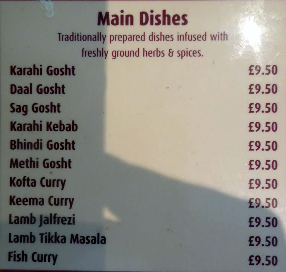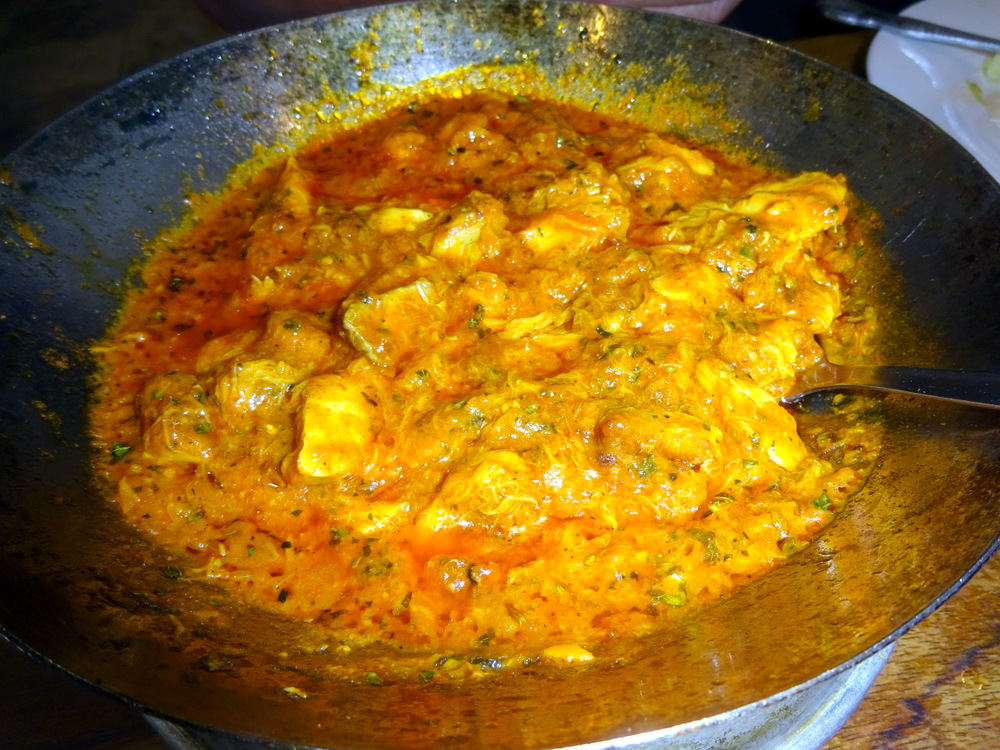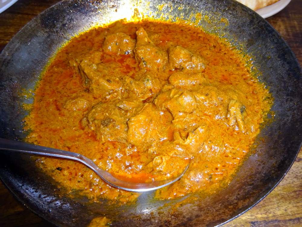 Twelve large pieces of Meat sat in a very traditional blended Masala. The first dip of the Naan revealed a Flavour that took me back in time. This was very much a Curry of the 1970s. The Spice Level and the Seasoning were very well judged. Most of the Meat was very soft, on the edge. As I ate, so I noted pulped Meat had thickened the Masala. Good as this was, it was far from sensational. Meat and Masala, I could have done with a Vegetable, Methi even, or heaven forbid – Rice. At the end I had to ask myself what was here that made this a Karahi and not simply a Lamb Curry.