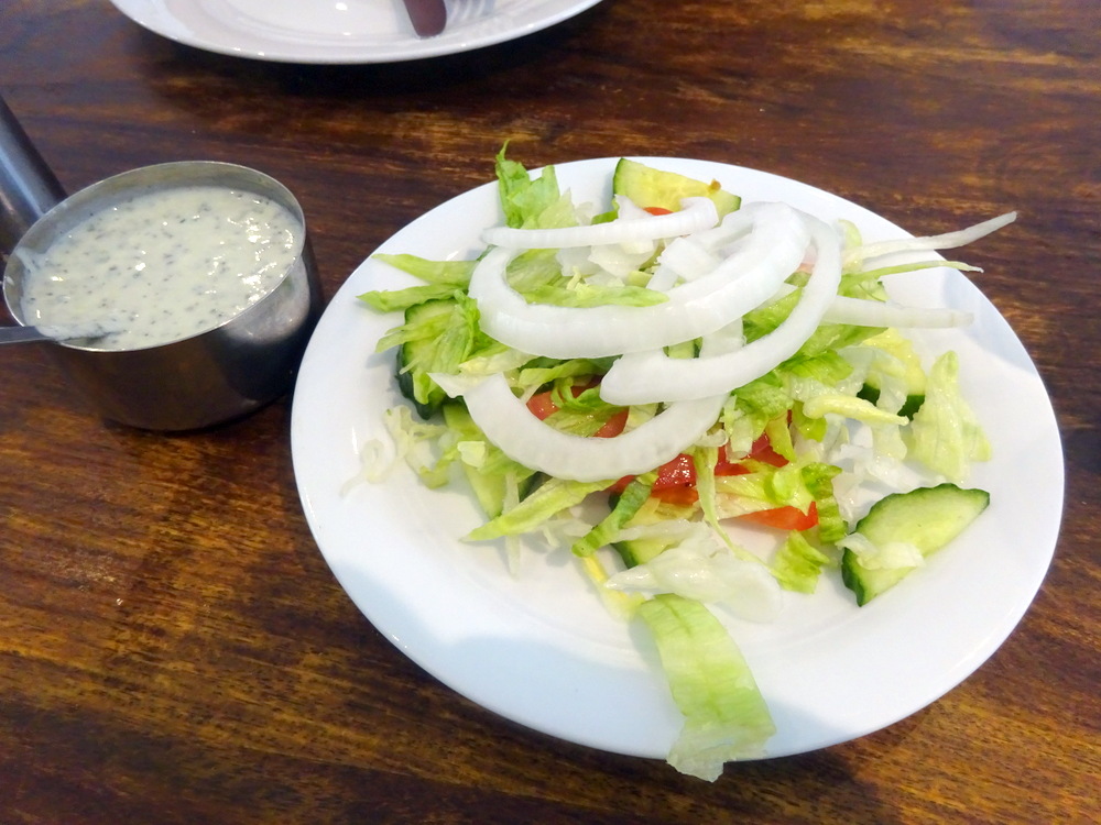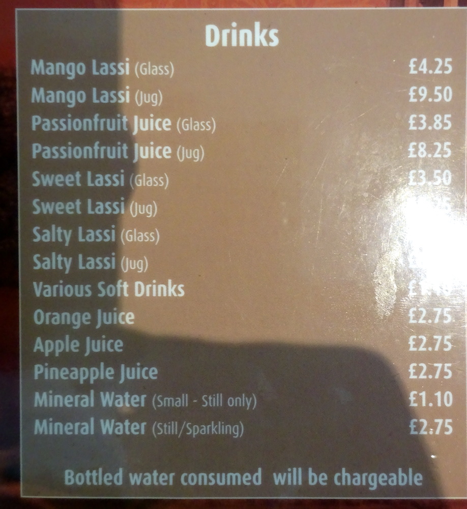 The Waiter brought a large bottle of Still Water (£2.75). I noticed that the adjacent chaps had not opened theirs. Ah, one is expected to pay for this. I asked for it to be changed to Sparkling, may as well have something I actually want. The bottle was placed on the table on the other side, it was never replaced, instead another Waiter brought a jug of Tap Water, not so cold, no ice, not refreshing. A modest Salad arrived too with a Raita.