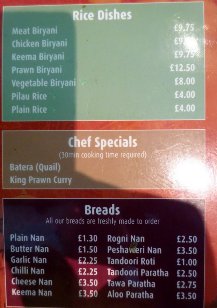 Last time I had an impressive Methi Gosht, time to try the Karahi Gosht (£9.50). Clive took the Fish option, Fish Curry (£9.50). The Waiter was happy to take my order for a Chilli and Coriander Naan (£2.25). I had to dissuade Clive from ordering a Keema Naan (£3.50), instead he would have an Aloo Paratha ((£3.50). Mince with Fish?