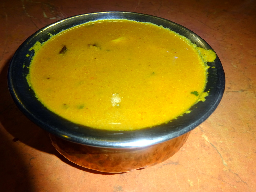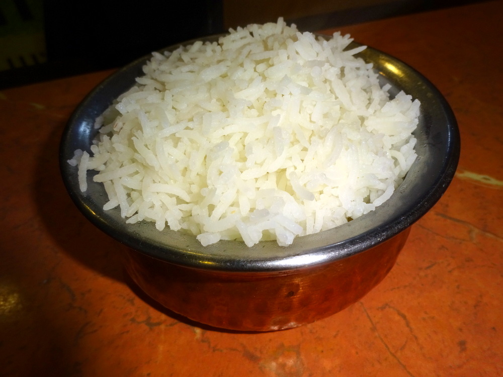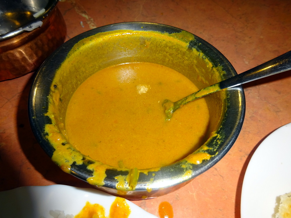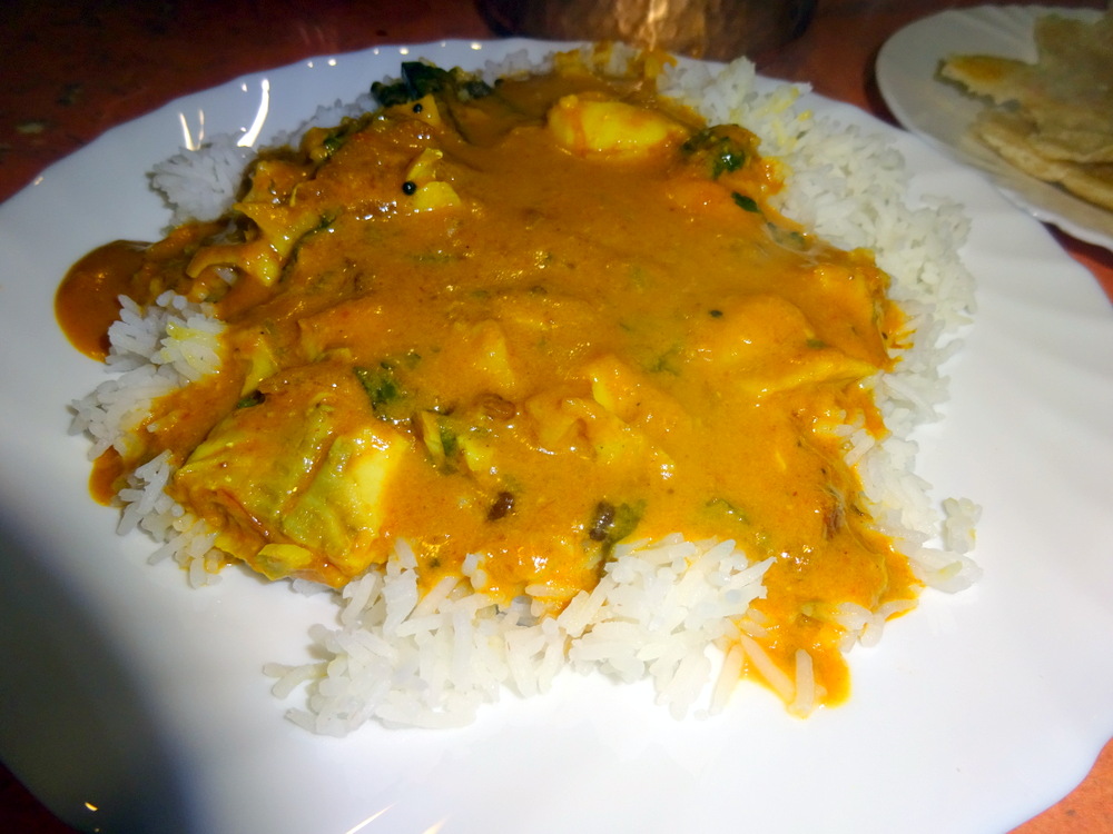 The Masala was Thin, abundant, but nothing like a Punjabi Shorva which is more – gravy-like. This had a sense of – Creaminess – about it. I found a string of what I took to be Spinach, cooked, in. A Shorva tends to become absorbed by Rice so one ends up with quite a Dry Curry with coloured Rice. This scenario was nothing like that, perhaps saturation point had already been reached when I started eating, there was still a lot of surface Sauce.