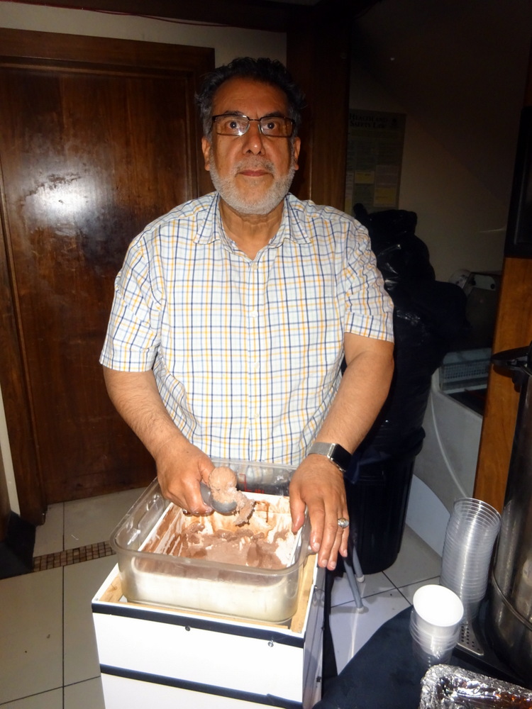Mr. Baig, Mein Host, was manning the Ice Cream, only Chocolate was left. News of Hector’s – Paya – request had already reached this end of the room, Hector was being mercilessly wound up, accused of wasting food. He knows me well.