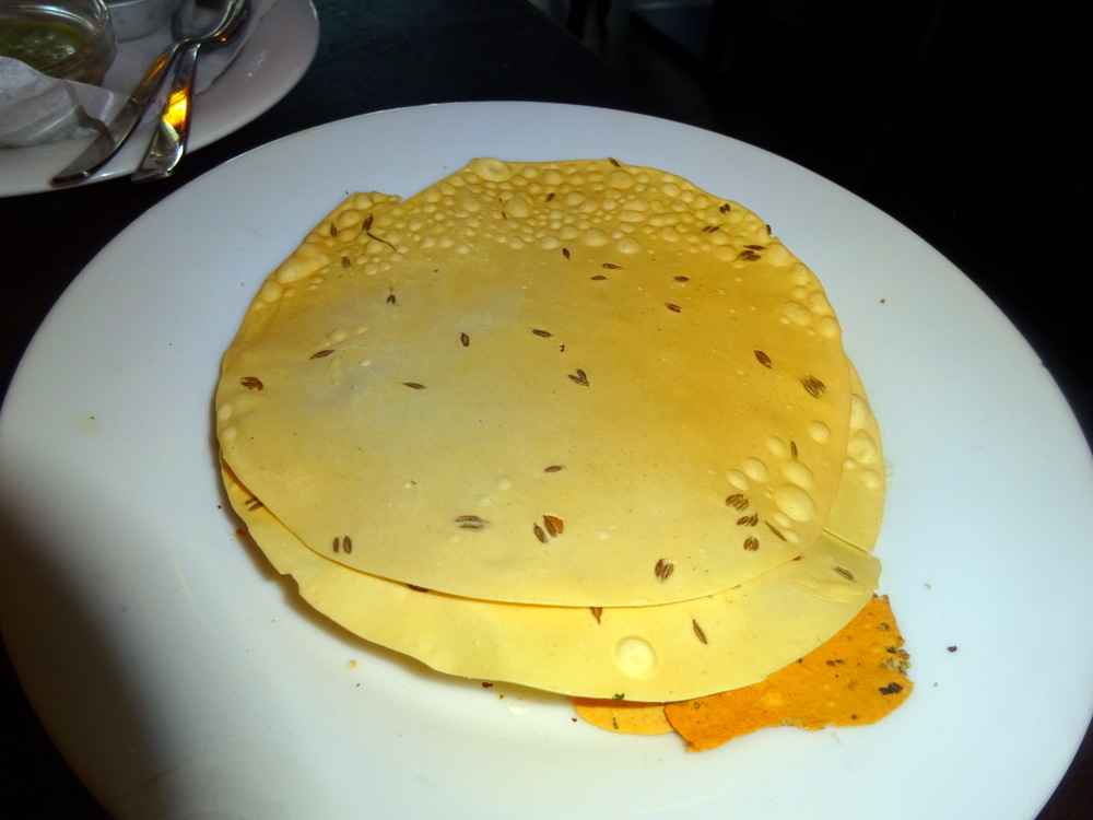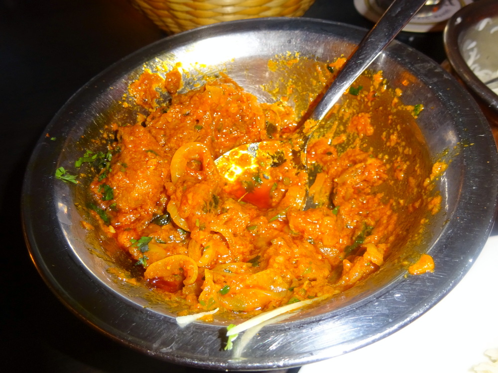The Poppadoms had embedded Cumin Seeds as is the Euro norm, much better than the Plain offerings served in the UK. The Red Sauce was Hot Chilli, the Green Sauce was – absolute hell, the milder Raita was most welcomed.