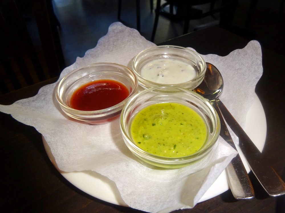 Arriving just after 12.30, there were as many people sitting outside as there were in, something to do with it being 32ºC perhaps. It’s great to feel real warmth and see blue skies, especially after the deluge that has befallen Scotland in the past week. I followed a waiter to the counter, he told me to chose any table. Hector’s OCD meant taking the same spot as last time. Poppadoms and Dips came in a flash.