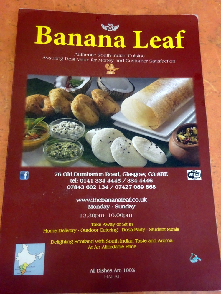 Banana Leaf (76B, Old Dumbarton Rd, Glasgow, G3 8RE), closed on a Tuesday, I