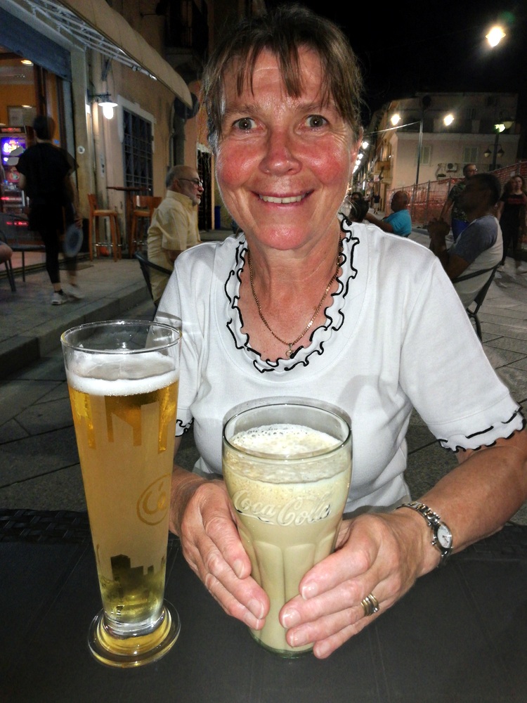 Today was a very long day, seven hours of actual travelling, with enforced two hours plus waits either side of the ferry from Bonifacio (Corsica, France) to Santa Teresa Gallura (Sardinia, Italia). Having had a substantial – Dejeuner – at Bonifacio, we were only looking for a snack as we wandered the busy streets of Olbia for the first time this evening. Marg declared that a – Green Salad – would be enough for her. Knowing of one Curry source in Olbia, Pak Kashmir Donner Kebab, this would be held back until lunchtime tomorrow. On spotting a Kebab Shop, Hector was straight in, alas all the seats outside were taken, we were not going to sit on the steps of the square as Marg suggested. The days of eating a late night Vegetable Pakora in a Shawlands close have long since gone. We moved on.