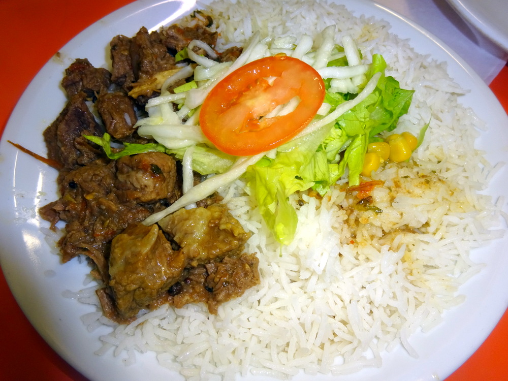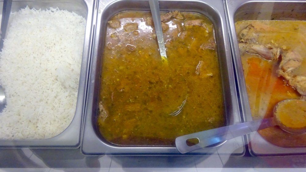 Moments later I spotted the magical words – Indian Food. There was no holding back the Hector. A dozy female who could have been a customer, but turned out to be a Waitress, was bypassed. Camera in hand, I approached the counter, there on display was Chicken Biryani, Chicken Curry on-the-bone and a Meat Curry.