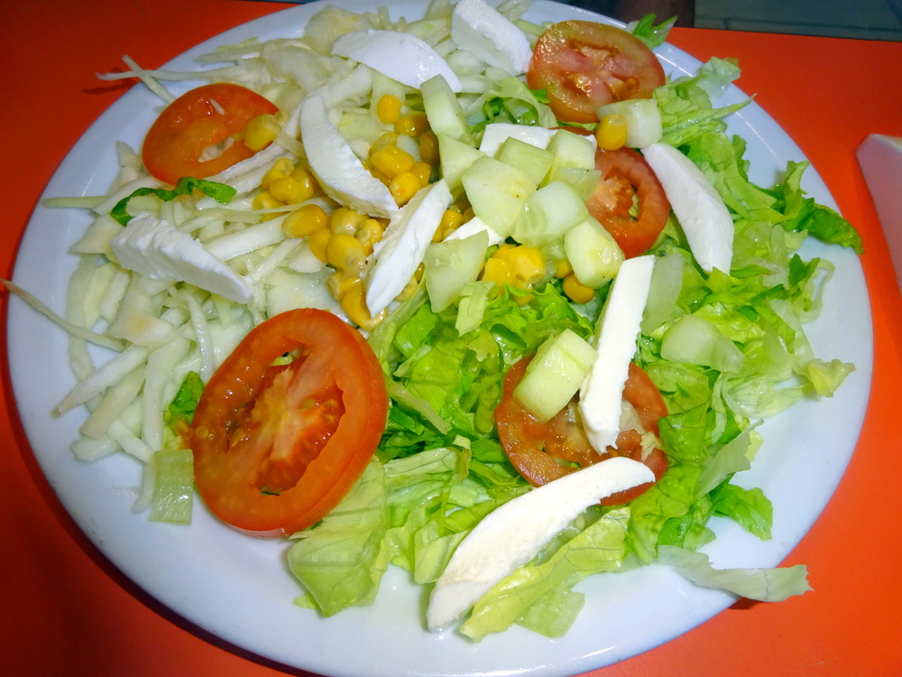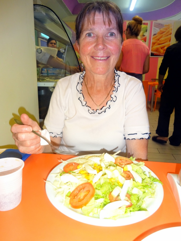 Marg’s Salad arrived, a big plateful for €3.00, but lacking the Black Olives which were illustrated. Marg, in her best French, attracted the attention of a Chap who also appeared to be a Waiter. The Black Olives were asked for, they never came. Maybe employing – Italian – would have been a better ploy. Olives aside, this Salad had everything Marg likes in a Green Salad.