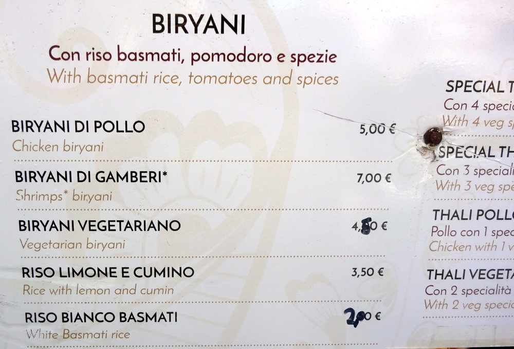 The Menus were already on the table. There were three Lamb Curry options. Shai Korma (€9.00) was dismissed as being – Creamy. The description of the Jalfrezi (€9.00) mentioned the dreaded – peppers. This left Agnello (Lamb) Vindaloo (€9.00) served Spicy, or not. I was in the mood for Rice today, however, the Bread list did impress. Riso Limone e Cumino (€2.50) sounded irresistible.