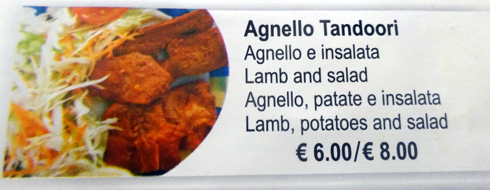 Marg chose Agnello Tandoori (€6.00), or Tandoori Lamb and Salad as illustrated. For extra €2.00, Potatoes could have been added.