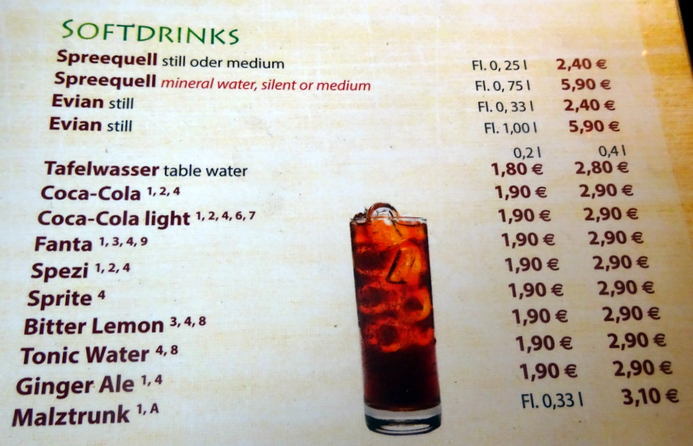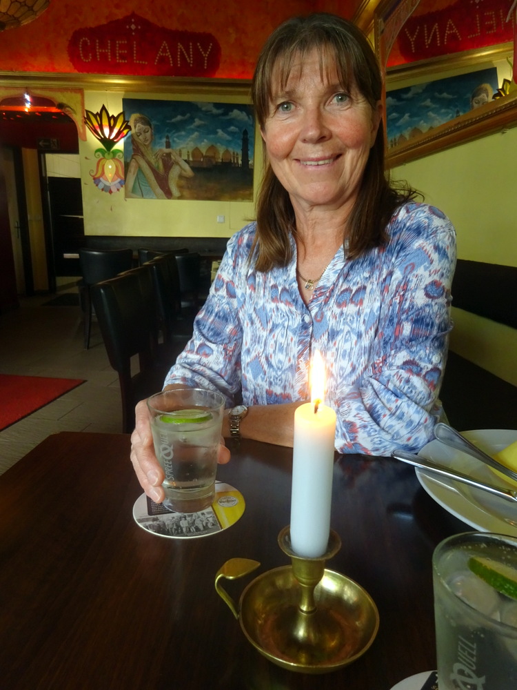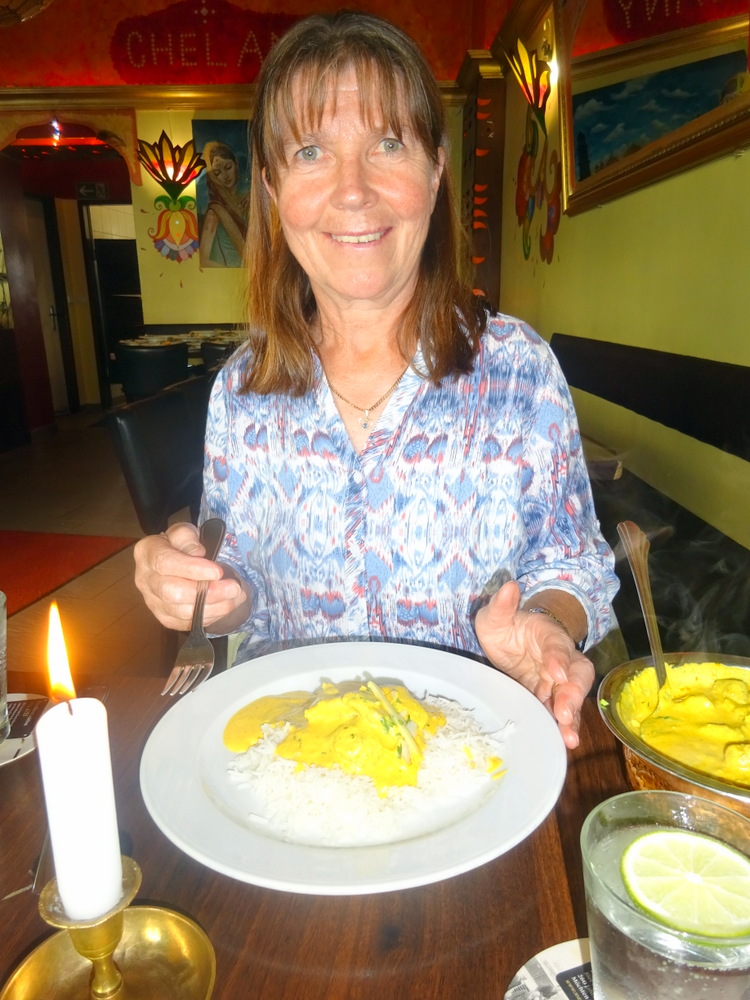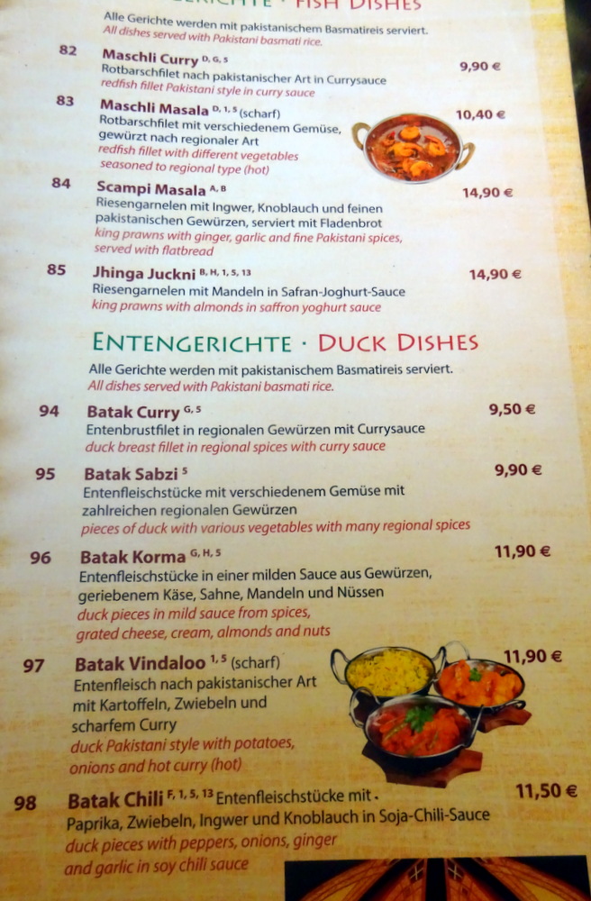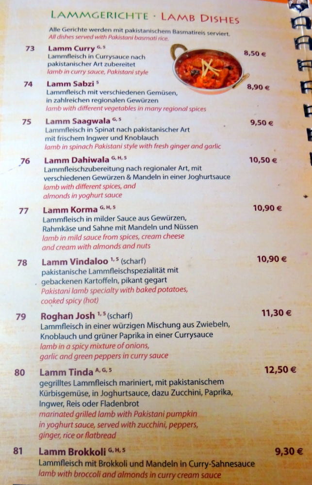 Having missed her summer holiday lunchtime salad, Marg was ready for Curry-Heute. Lamm Dahiwala (€10.50) – lamb with different spices, and almonds in yoghurt sauce – was almost the definition of a – Marg Curry, and the antitheses of a Hector Curry. Both descriptions used the word – different – I wondered in what way this would be so. As is the custom in European Curry Houses, Basmati was included in the price of the Main Courses. A 750ml bottle of Sparkling Water (€5.90) – ouch – would complete the Order. For €5.80 we could have had 800ml of any other Soft Drink, unglaublich.