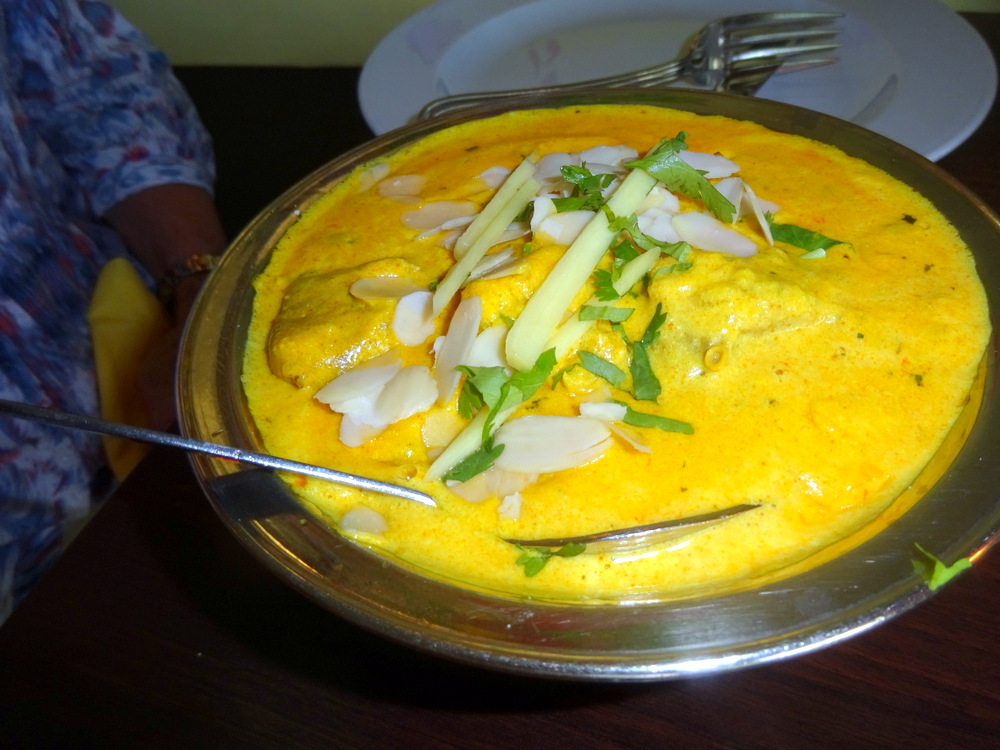 Topped with Ginger Strips, Almonds and a hint of a Herb which could have been Coriander, this Curry was well presented. The Creamy, Yellow Masala was decidedly – Soupy. The colour apart, this was Marg’s ideal Curry. We have come to accept that in both Patia and Korma, Chicken actually works better with this type of Masala. Marg was more than happy with the Lamb. As ever, a Soupçon came in Hector’s direction.