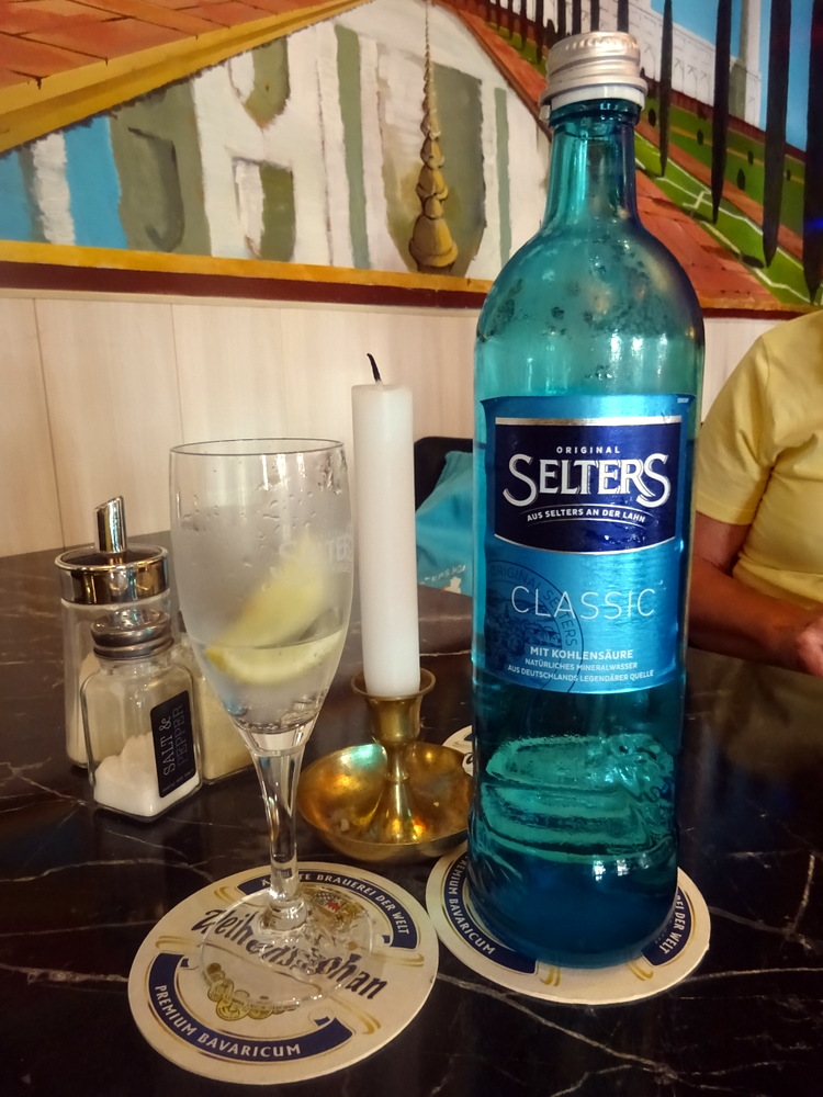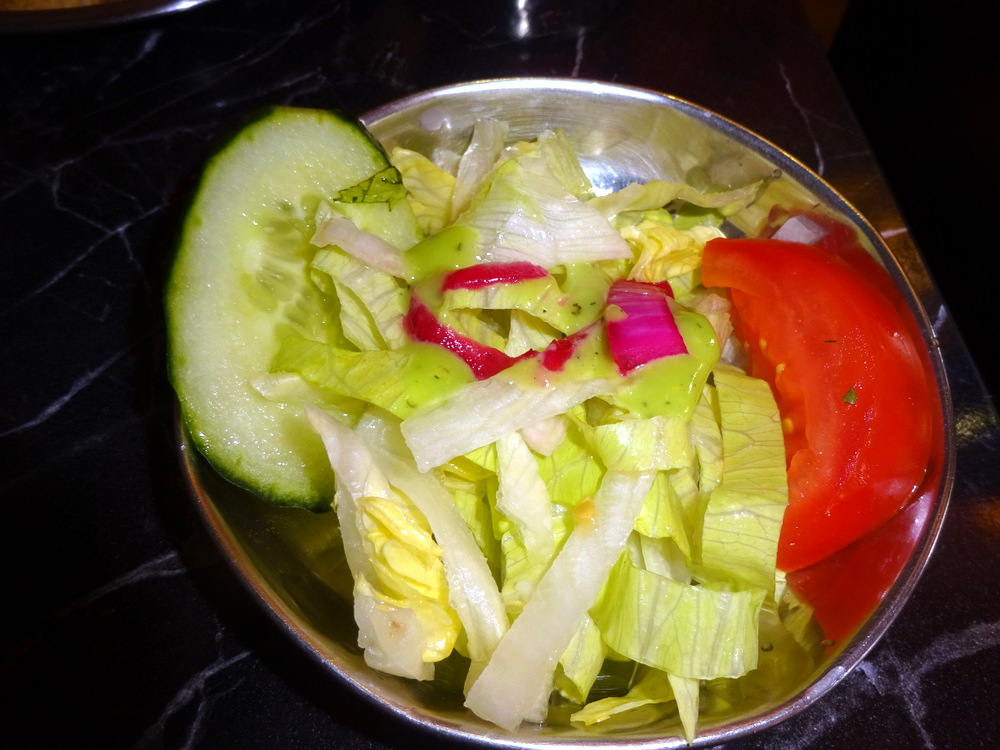 Marg decided to have a big blow out and order two Poppadoms: Papadum (€0.50) and Mango Chutney (€1.50) to arrive at the same time as the Lamm Vindaloo. A 750ml bottle of Wasser Classic (€4.90) completed the Order. Once again, a bit steep for Sparkling Water. All – Main Courses – are served with Rice and Salad, so overall, one cannot really complain.