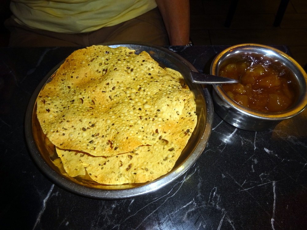 Meanwhile, Marg took care of the accompanying Salad. The Poppadoms were well toasted and had the embedded Cumin Seeds. Marg received three Poppadoms, presumably the third was part of the Mittagstich. All was well in Berlin-Heute.