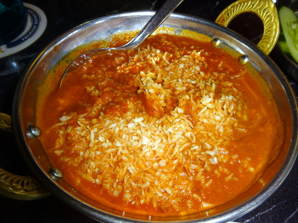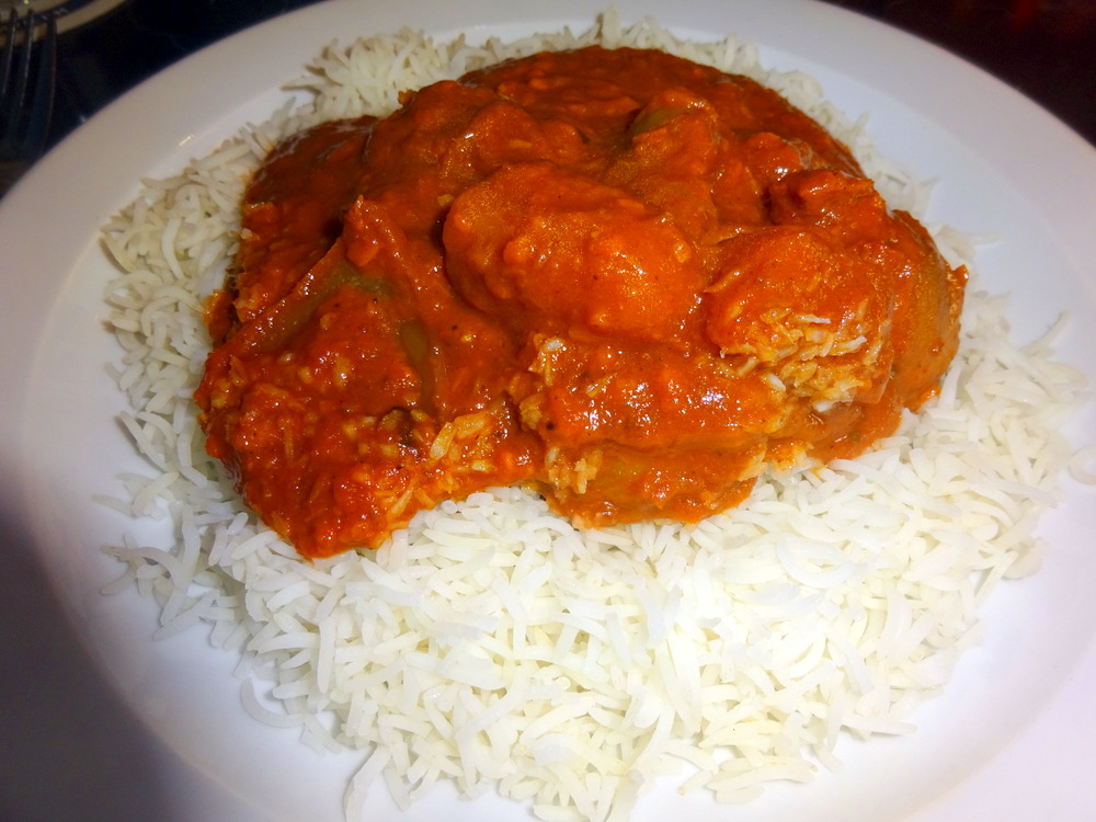 The appearance did worry: unnaturally – Red – Oily – and surely all these white grains were not – Coconut? Having stirred and decanted, things certainly improved. I counted six decent sized pieces of Meat and only two pieces of Potato. At least there was Potato. The payback, however, was three Big Blobs of Onion.