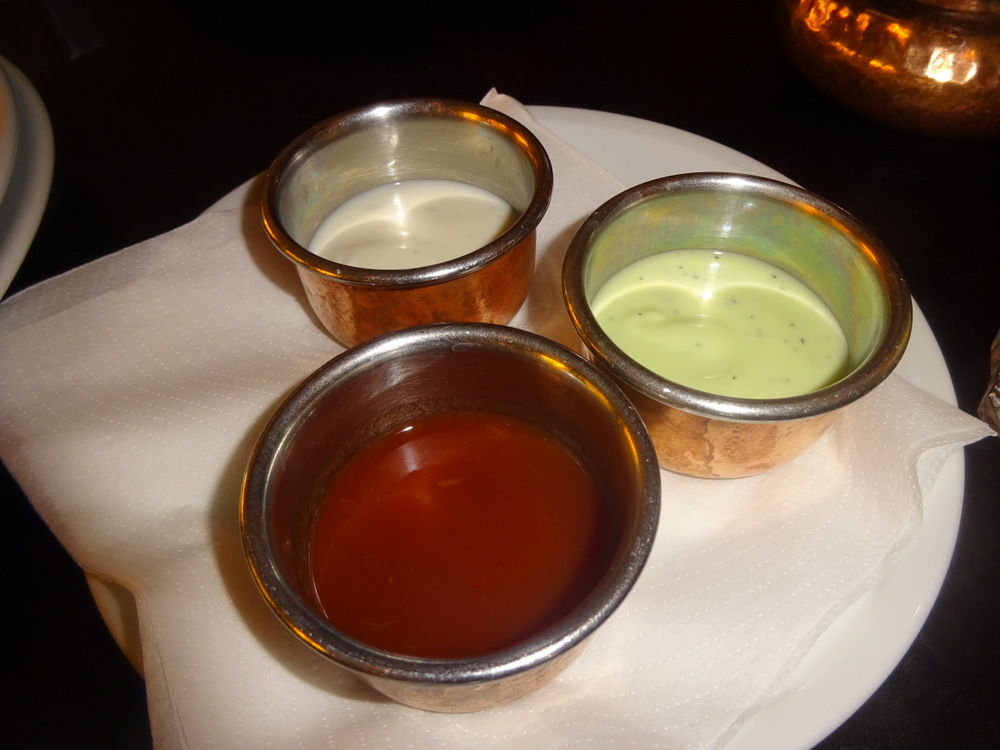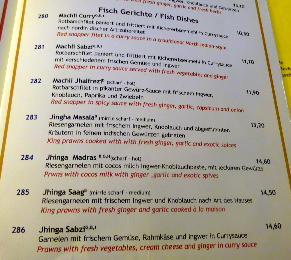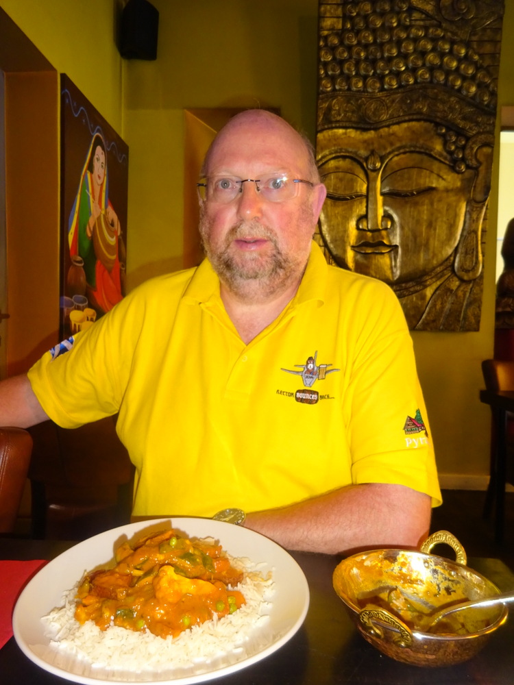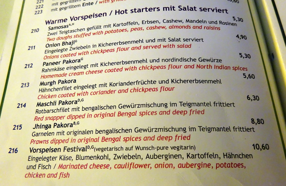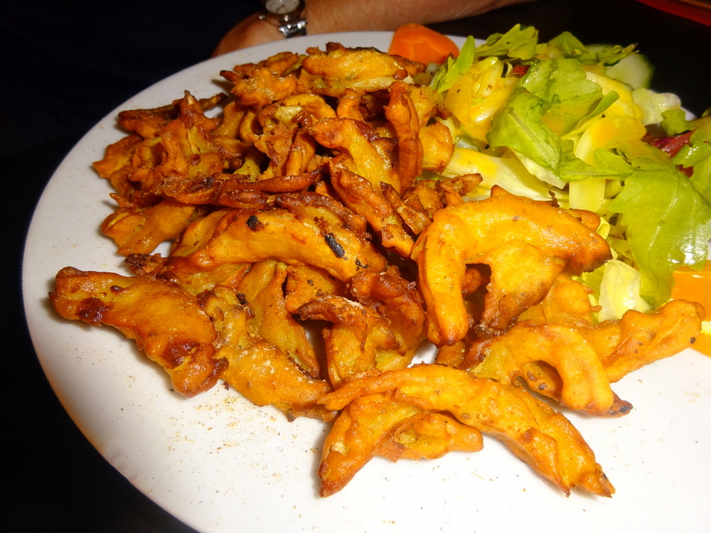 When Marg and I attended a cookery demonstration in Jaipur, we were told there is no such thing as Onion Bhaji. My perception is that it is a poor version of Pakora. There was a Curry House in Köln Sud which sold the largest Onion Bhaji ever seen, it closed before I had the opperchancity to sample the fayre. What was served today at Swera was a possibly unique interpretation of Onion Bhaji. Worms – is how I described this to Marg. Strips of Onion, deep fried in Batter. Marg is doing a lot of deep-fried currently. With the Salad and the three Dips, Marg had quite a lunch. She enjoyed it.