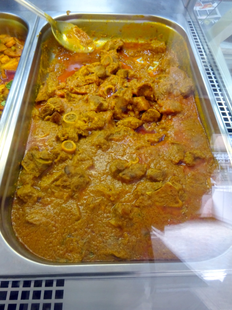 Marg desired Vegetable Pakora. It took me a while to establish the price even though it was posted on the wall and on the display board above the counter. I saw no paper menus. Ah, £3.50. The Karahi Gosht was declared to be on-the-bone which is what I hoped for. A Paratha (£1.50) would accompany. Marg took a bottle of Cola Zero from the fridge. I didn’t look to see if there was Sparling Water. I still felt that I might be served at the table.