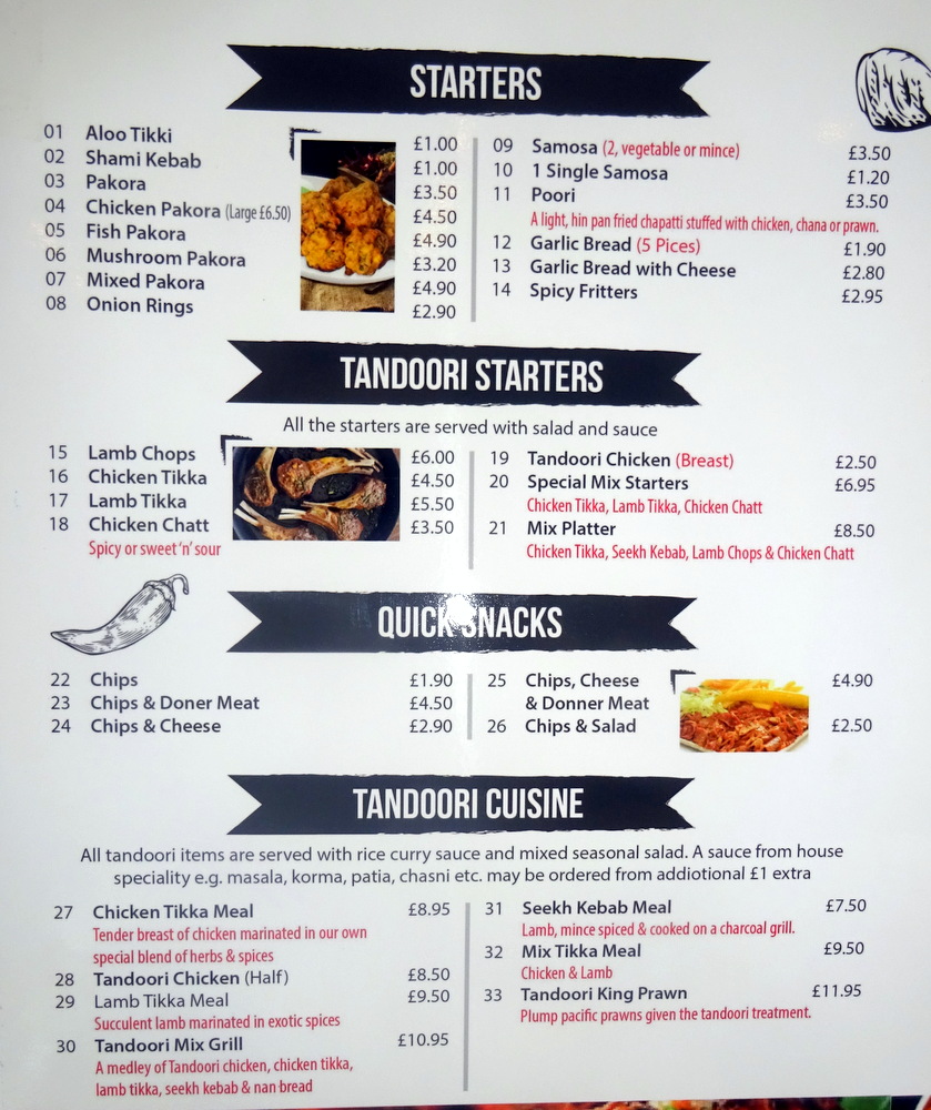 I took in the various Burgers and Kebabs on display under the counter. The Curry Menu was on the wall, posted below.