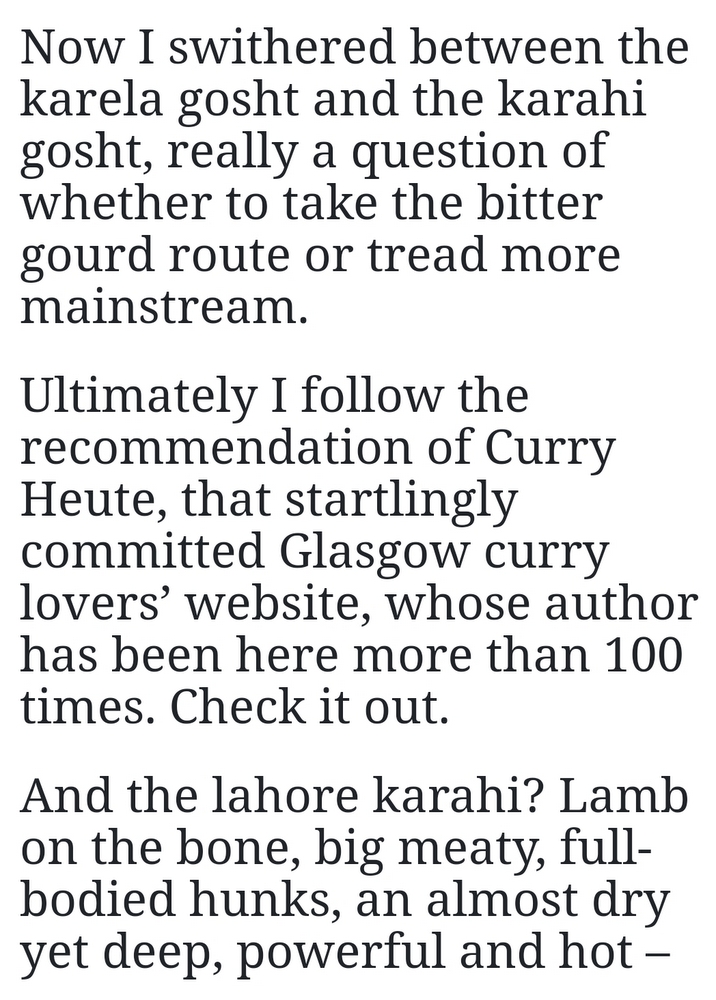 When the Huwaei was switched on late this morning, Hector was made aware of – Curry-Heute – being mentioned today in Scotland’s leading broadsheet – The Herald. Ron MacKenna, their food writer, had finally made it to Karahi Palace. He saw it for what it is, a modest Curry Cafe serving outstanding Curry.