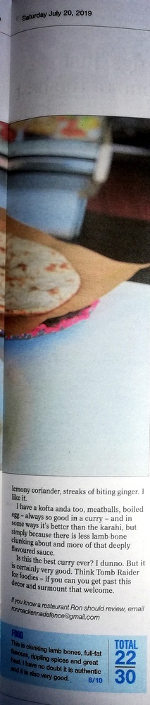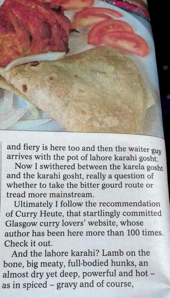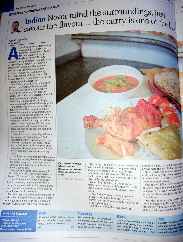 Last Saturday, Ron MacKenna of – The Herald – wrote a very favourable review of Karahi Palace. Having consulted – Curry-Heute – he too ordered Karahi Gosht, though the published photo was of a leg of Chicken and a very wet Curry. Karahi Gosht is entirely different, well it is when served properly as it most certainly is – here.