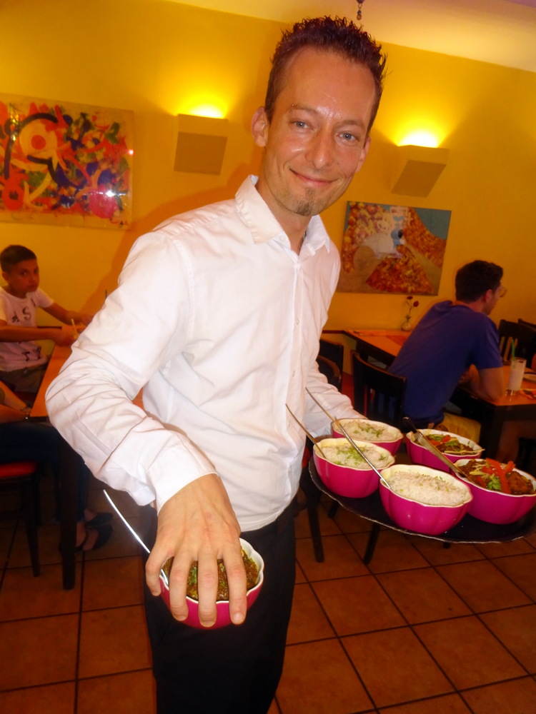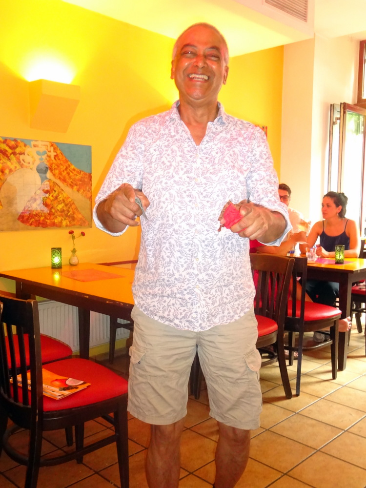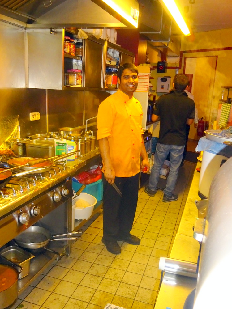 Lord Clive and Lady Maggie of Crawley arrived in München late last night. They were waiting at the main Augustiner House to accompany Hector to Indian Mango. Mr. O’Leary’s flight from Edinburgh to Memmingen was a fraction of Mr. Stelios’ flight to München Flughafen, it just meant a wasted ninety minutes at Memmingen waiting for a bus. So it goes. It was 19.00 when we arrived at Indian Mango, Herr Battra, the Manager, was outside serving, there was a suitably warm welcome when he saw the three of us. Many tables inside were occupied, we managed to get one adjacent to the cooking area. It was only then I spotted the proprietor – Mr. Jolly Kunjappu – who was deep in conversation with a family. His reaction on spotting us was captured for all time. Next up it was the Waiter, Sebastian, who has been here for years.