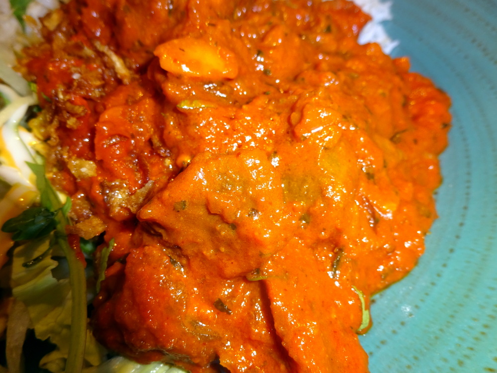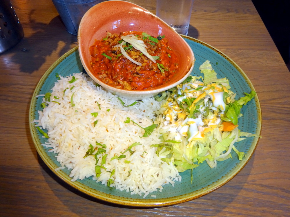 The Curry sat on a plate which had a huge portion of Rice and the promised Salad, not the customary – Side Salad – then. It felt sensible to decant the Curry to the available space rather than cover the Rice.