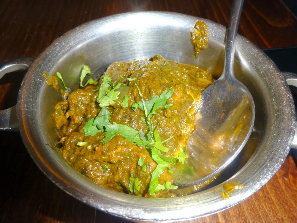 I ate from the pot, why bother decanting when I had no more Rice? Five large pieces of Meat sat in an appropriately Dark, Herb-rich Masala. I write often of my preference for Masala with Herbs rather than a mass of Herbs. There was a clever balance here, just enough Masala to convince that this was how I like it, but a very visible mass of Herbs. The Spinach I could taste, however, I felt there had to be more in there. I know Yadgar use five different Herbs in their Saag/Palak, this was along similar lines.
