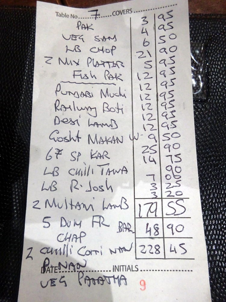 I did suggest we make my life simpler by all ordering the same thing, not to be. Marg took the Fish option – Punjabi Muchli (£12.95) with a solitary Chapatti (£0.90). Eleanor had me convinced that she was having the Multani Lamb, but in fact chose the Railway Boti (£12.95). When Eleanor mentioned Rice, Rocky suggested that he bring four bowls (£2.50 – £2.95 ?) for sharing. As more Bread was being ordered, this made sense. Steve followed Hector’s Naan choice, Kirsty called for a Peshwari Naan (£3.25) and Howard, a Vegetable Paratha (£3.25).