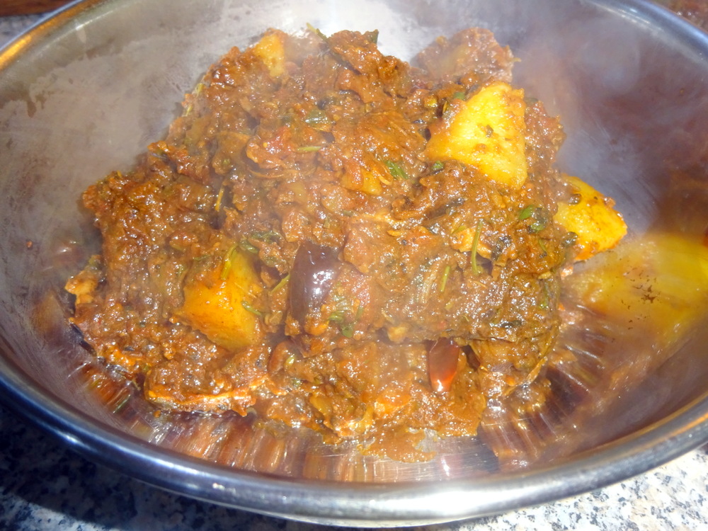 The published – Pork Vindaloo Recipe – was the base for this creation, somehow, Tamarind found its way in too. The Masala was not blended and the surface Oil was scooped off to create a much Drier Curry than shown previously.