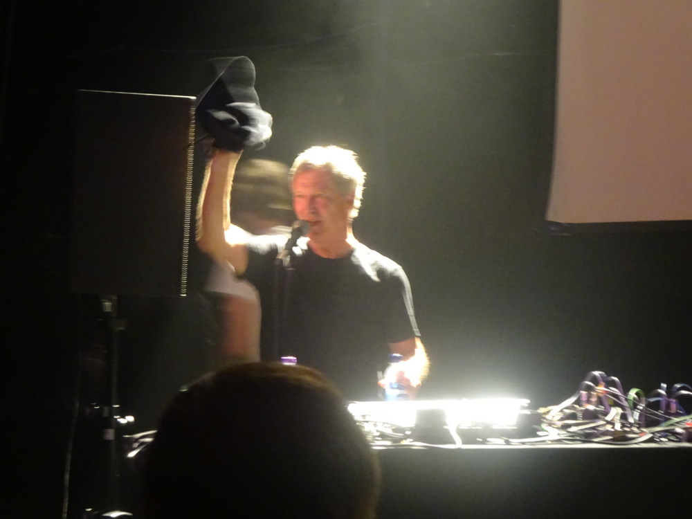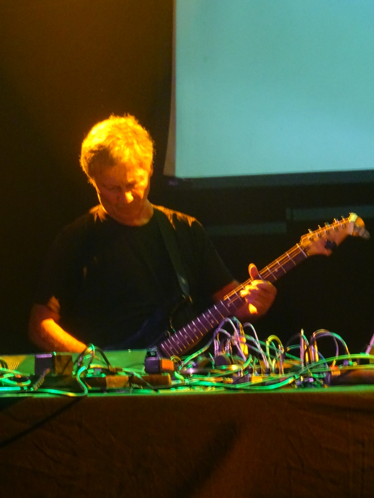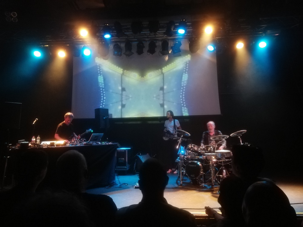 Doors open at 19.00, – plus Special Guests – said the ticket. The room was surprisingly empty at 19.30 when we entered, there was no support act. Instead a chap sat at a laptop and played stuff that nobody knew. How do these guys get these gigs, and why are they indulged? A posted notice said Michael Rother would take to the stage at 20.30, he did, more or less.